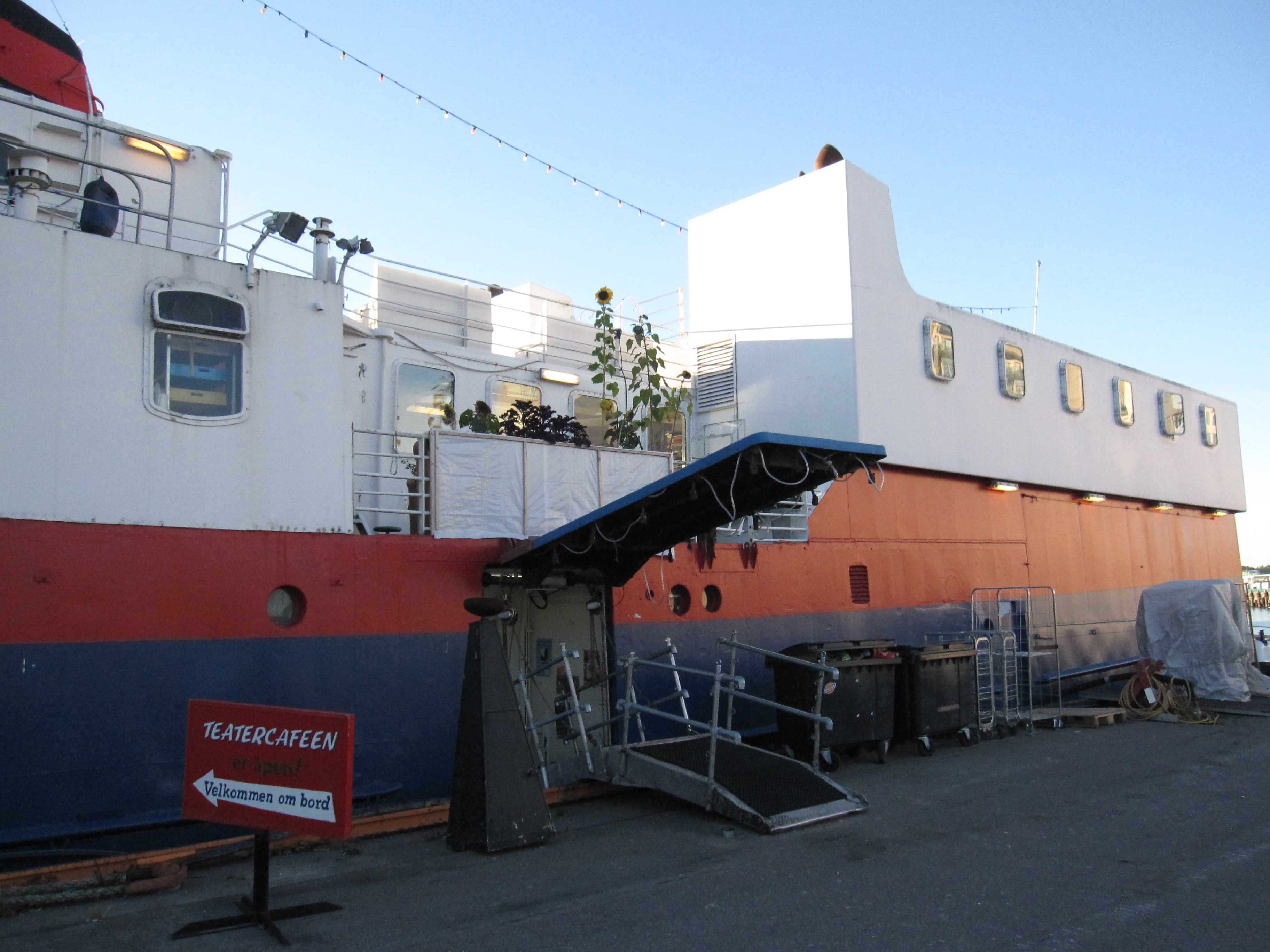 Fotografi av teaterbåten MS Innvik sett fra Langkaia.