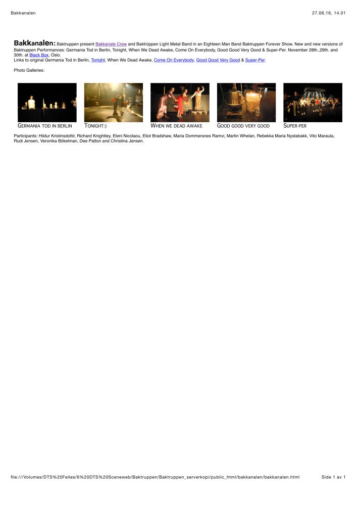 Informasjon publisert på Baktruppens nettside om Baktruppens produksjon "Bakkanalen" (2008)