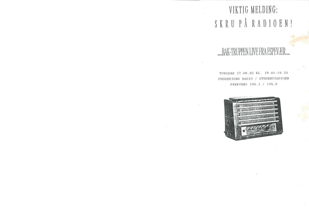 Flyer fra Baktruppens performance "Bak-truppen live from Espevær" (1992)
