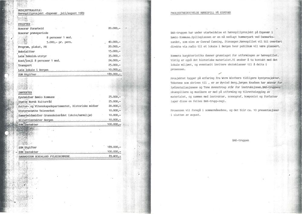 Prosjektbeskrivelse til Baktruppens performance "Bak-truppen live from Espevær" (1992)