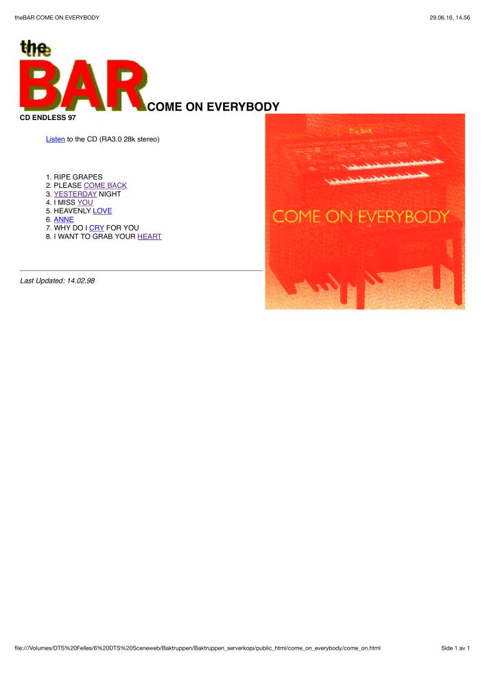 Informasjonsark fra Baktruppens konsert "Come On Everybody" (1997), publisert på nettsiden til Baktruppen http://baktruppen.bek.no.