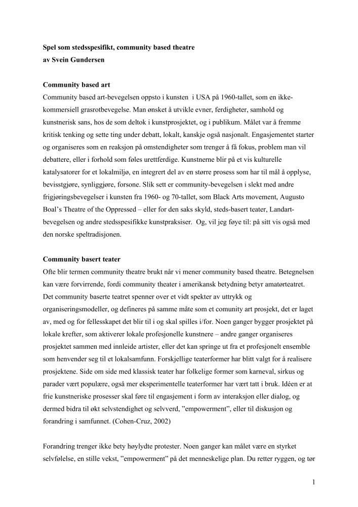 Spel som stedsspesifikt, community based theatre. Artikkel av Svein Gundersen om spel. Artikkelen ble publisert i Estetikk og samfunn, Fagbokforlaget 2015.