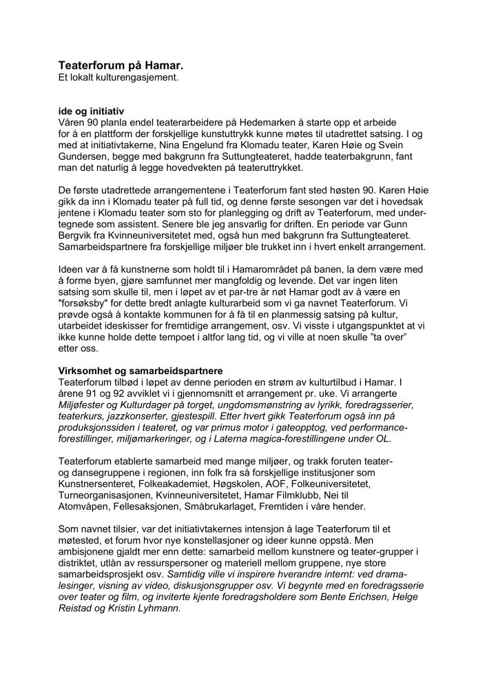 Teaterforum på Hamar. Et lokalt kulturengasjement. Artikkel av Svein Gundersen om Teaterforum. Artikkelen ble skrevet i 1996, publiseringssted ukjent.