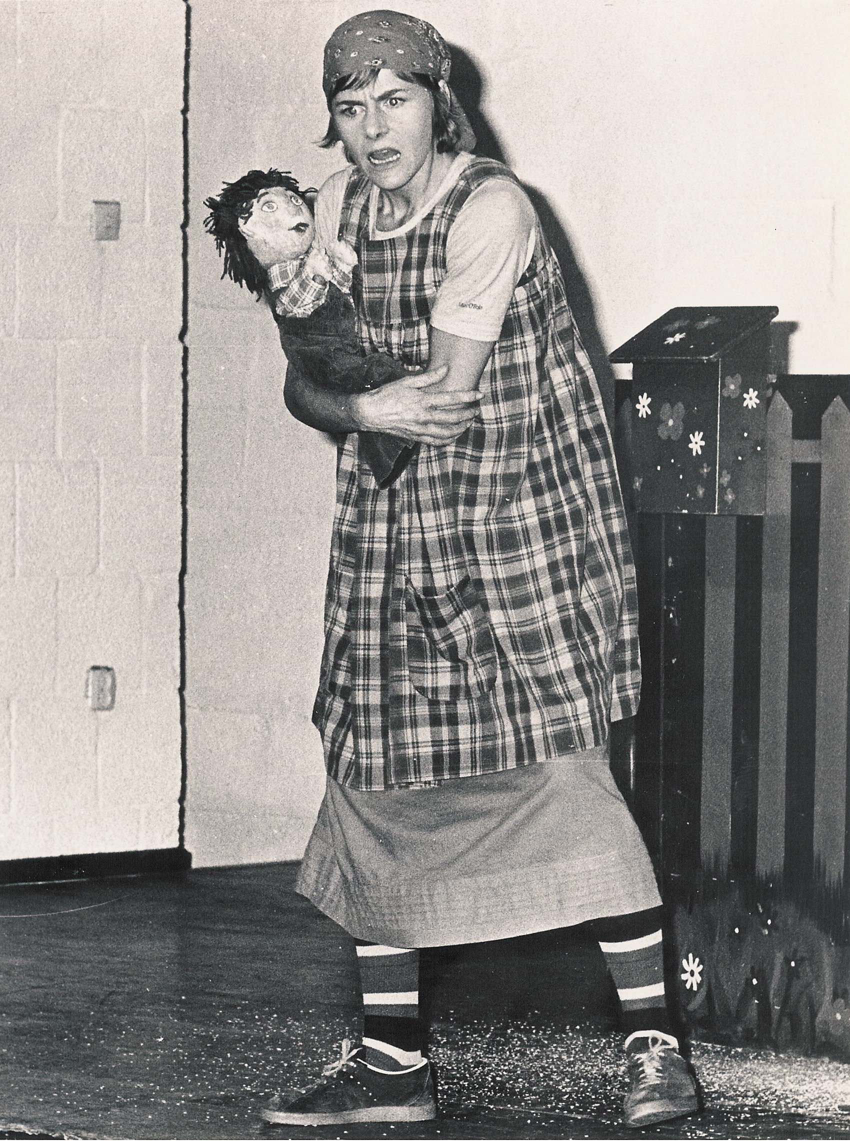 Fotografi fra Musidra Teaters produksjon Fru Petrine Sørensen(1977). Nyinstudering av Musidra Teater med Camilla Tostrup Worsley og Per Skjølsvik. (Scenario m.m.: Helge Reistad, Kristin Holteng og Per Skjølsvik, musikkdramatisk utgave). Regi: Helge Reistad.
