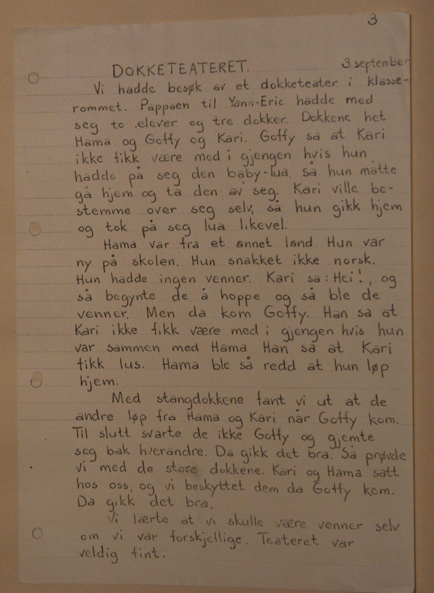 Dokketeateret. Omtale av Musidra Teaters produksjoner Hjemmebarn og Fremmedbarn (1979). Omtalen ble skrevet av et av barna i publikum, ikke publisert.
