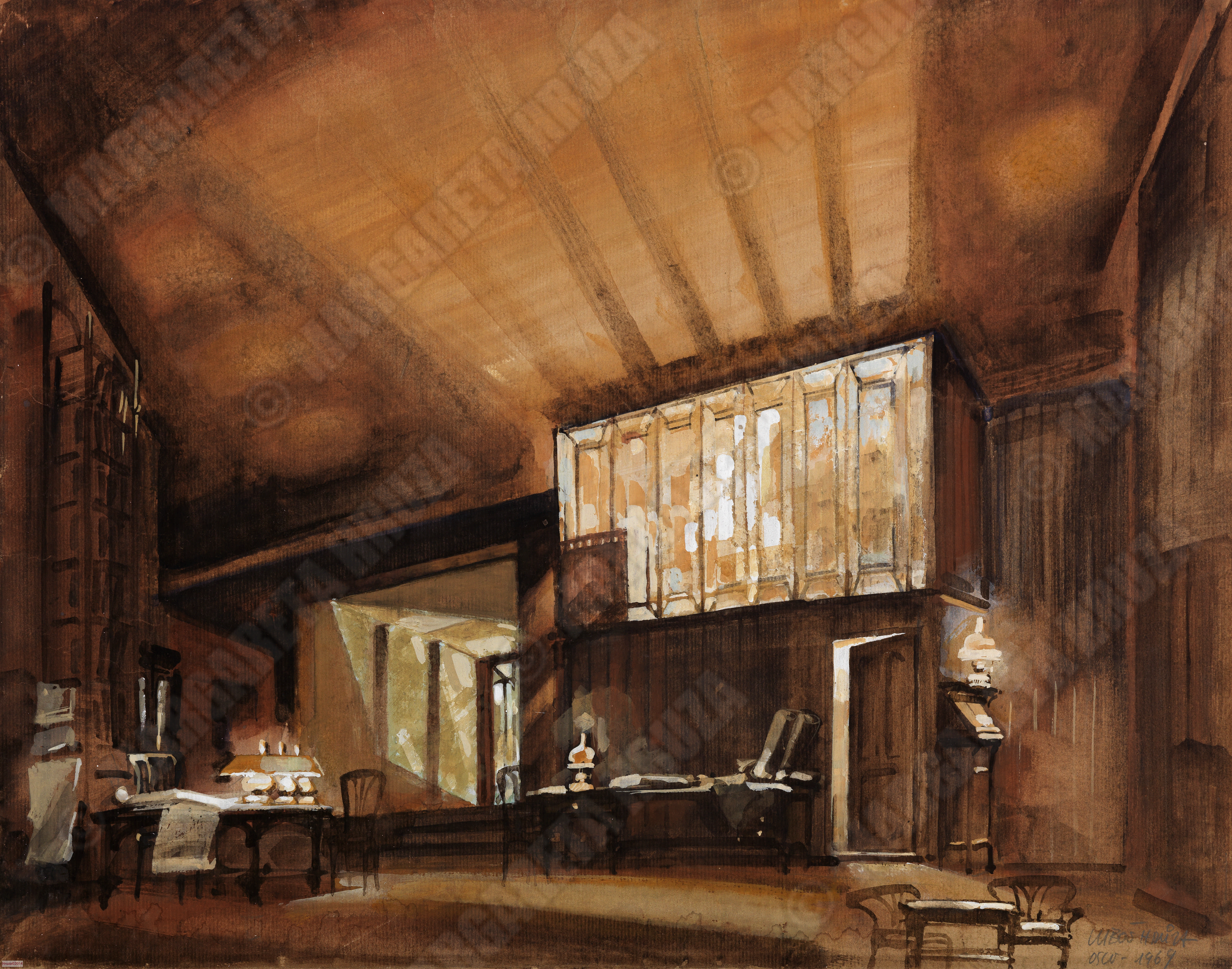 Maleri av Lubos Hruza til sceneløsning av akt 1 i Byggmester Solness, 1969, Nationaltheatret