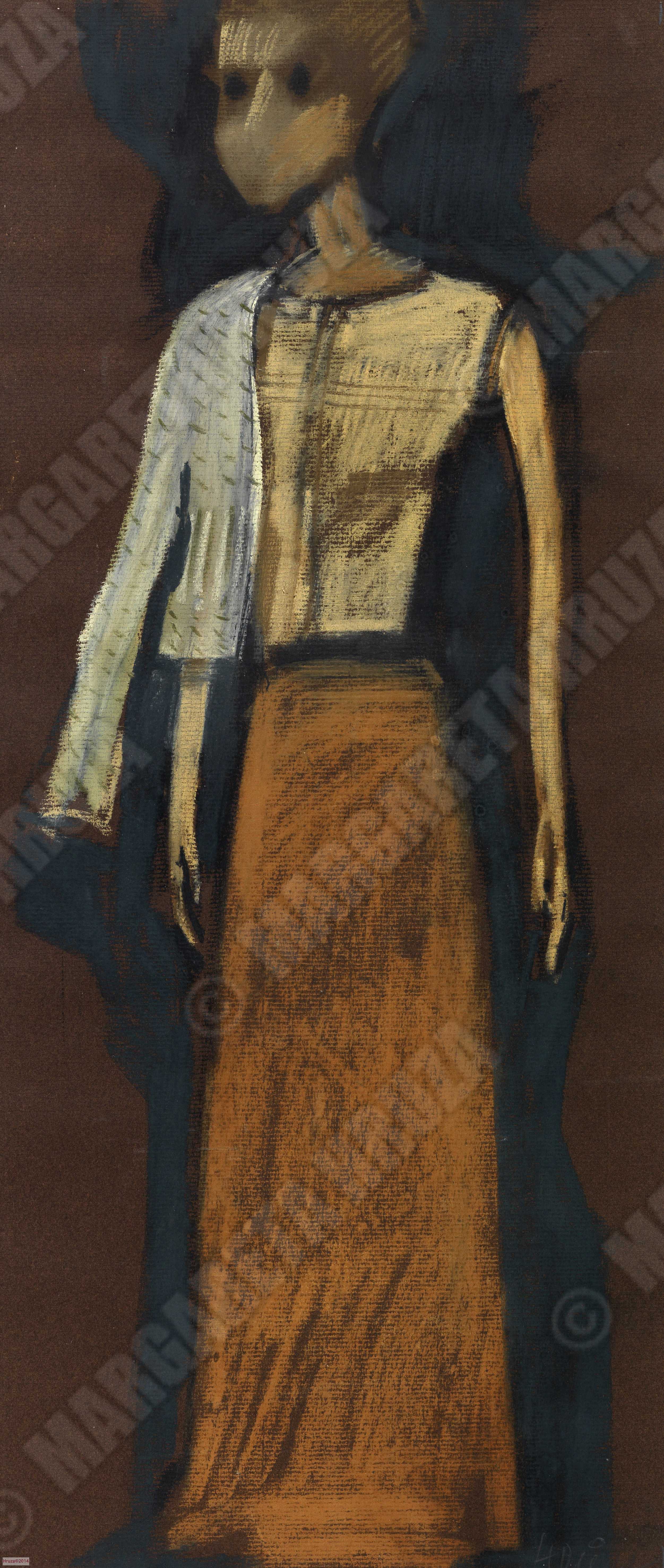 Kostymetegning av Lubos Hruza til skuespilleren Henny Moan som frøken Hilde Wangel i produksjonen av Henrik IbsensByggmester Solness. Produksjonen hadde premiere på Nationaltheatret 11. oktober 1969.