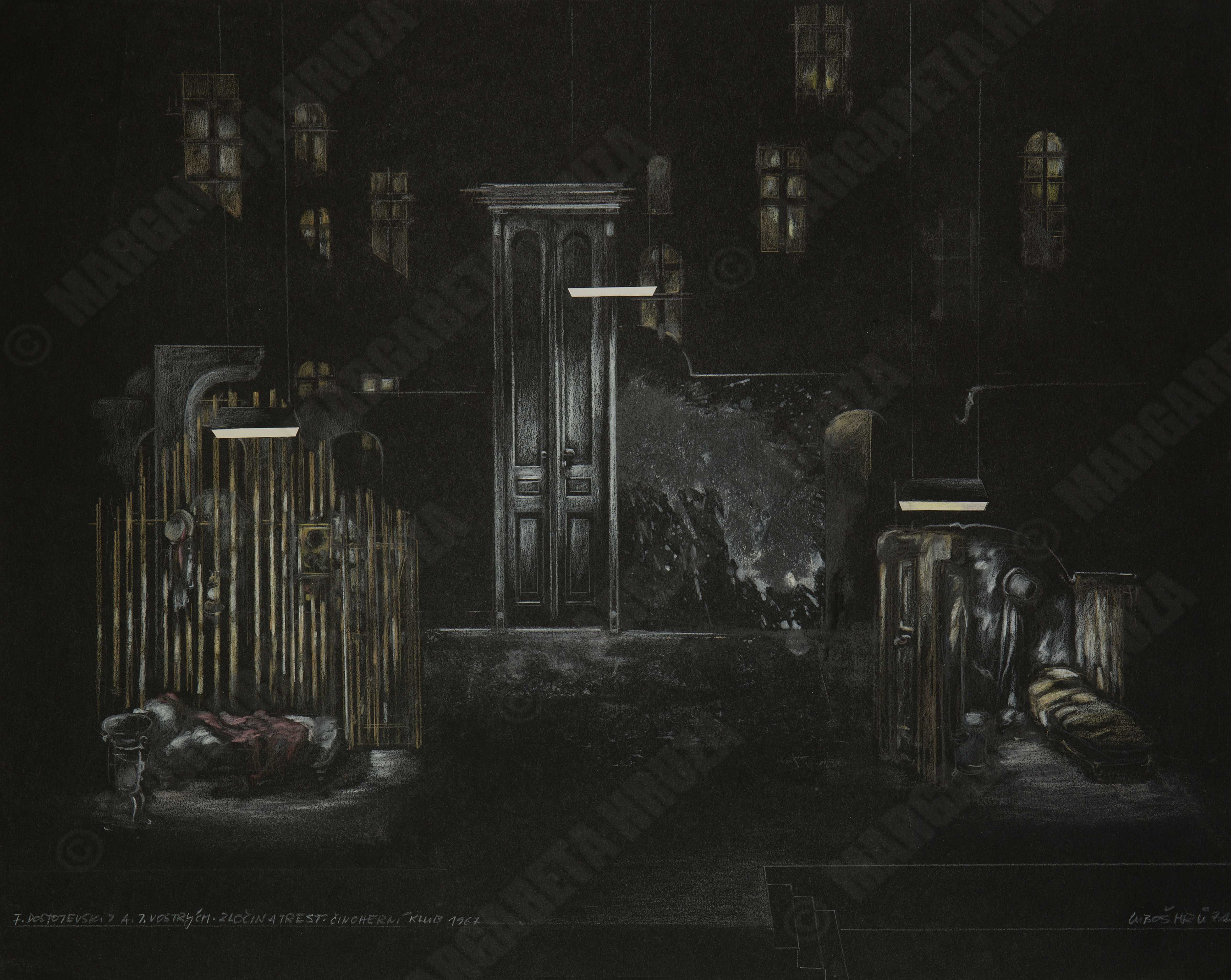Maleri av Lubos Hruza, Maleriet viser sceneløsningen til produksjonenZlocin a Trest, som hadde premiere på Cinoherni Klub i Praha 20. april 1966. Produksjonen inspirerte Raskolnikov, som ble satt opp på Nationaltheatrets hovedscene og hadde premiere 11. september 1968.