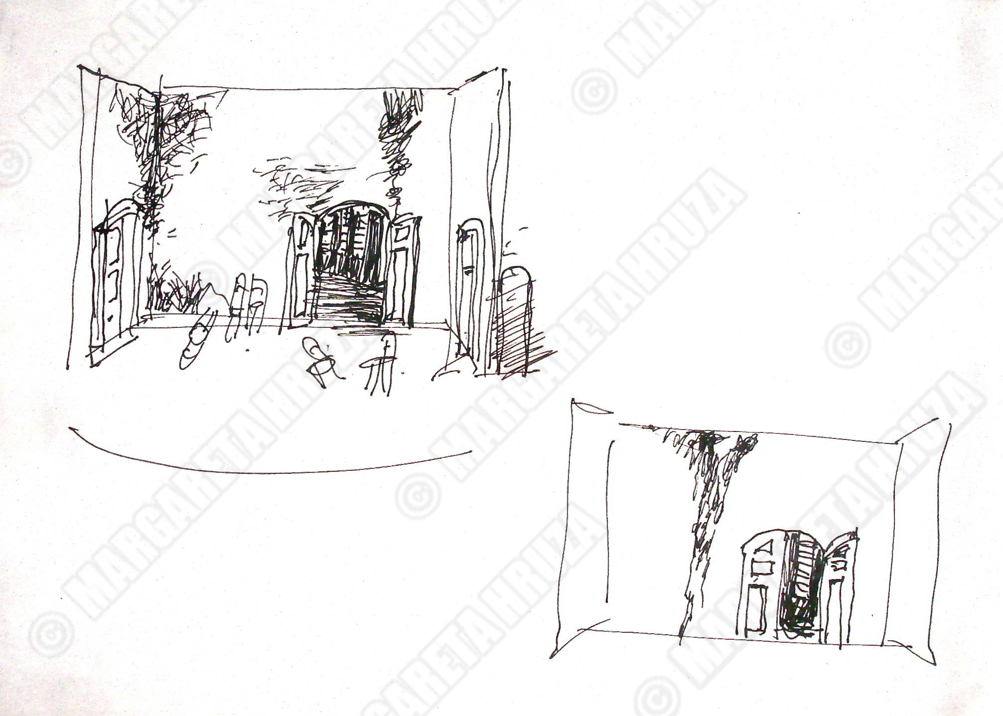 Tegning av Lubos Hruza til sceneløsning av Kirsebærhaven, 1971, Nationaltheatret, Amfiscenen