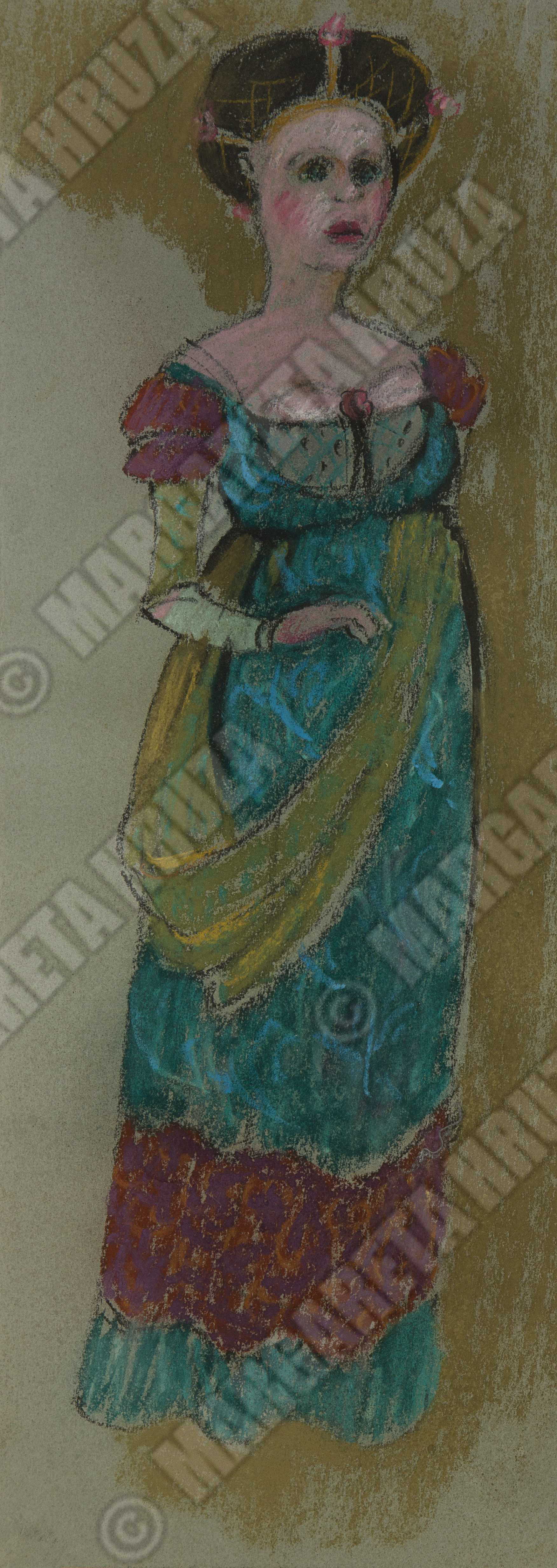 Kostymetegning av Lubos Hruza til sangeren Ruth Linge i rollen som Nella, Gherardos kone, i operaproduksjonen Gianni Schicchi. Produksjonen ble satt opp på Den Norske Opera i Folketeaterbygningen og hadde premiere 5. februar, 1973.