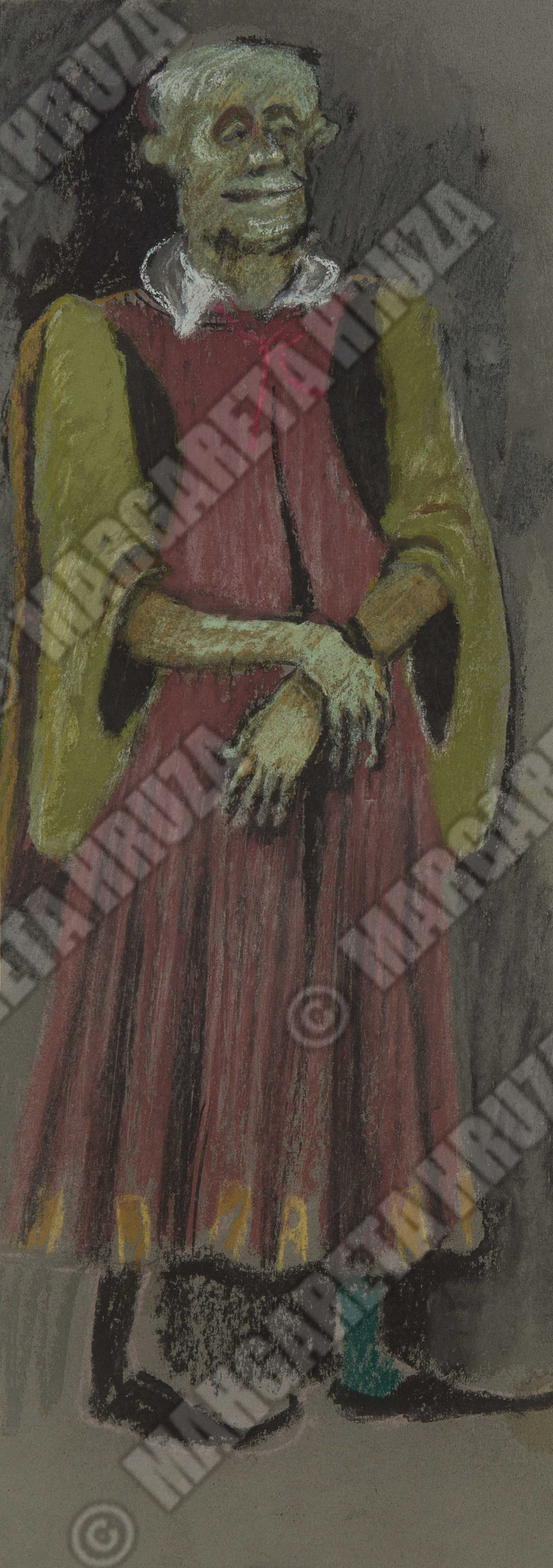 Kostymetegning av Lubos Hruza til produksjonen Gianni Schicchi, en operaproduksjon av Den Norske Opera. Produksjonen ble satt opp på Den Norske Opera i Folketeaterbygningen og hadde premiere 5. februar, 1973.