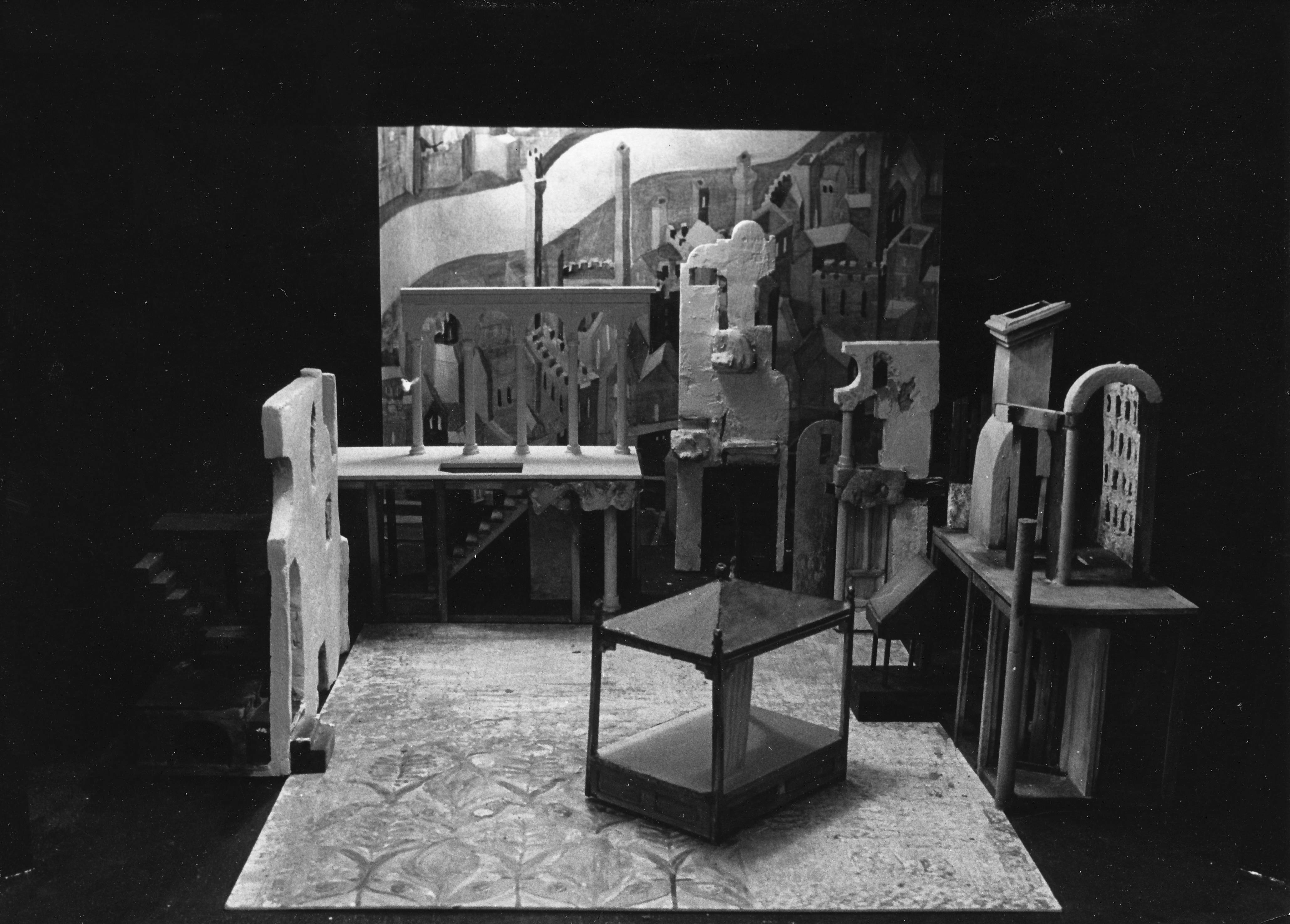 Fotografi av scenografimodellen av Lubos Hruza til Gianni Schicchi, en produksjonen som ble satt opp på Den Norske Opera i Folketeaterbygningen og hadde premiere 5. februar, 1973.