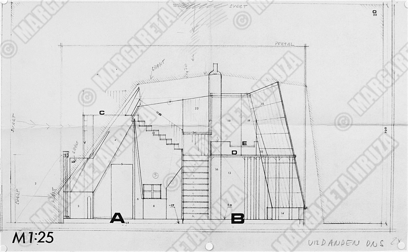 Teknisk tegning av Lubos Hruza til sceneløsning av teaterproduksjon Vildanden (1974) av Henrik Ibsen. Produksjonen hadde premiere 5. mars, 1974 på Den Nationale Scene.