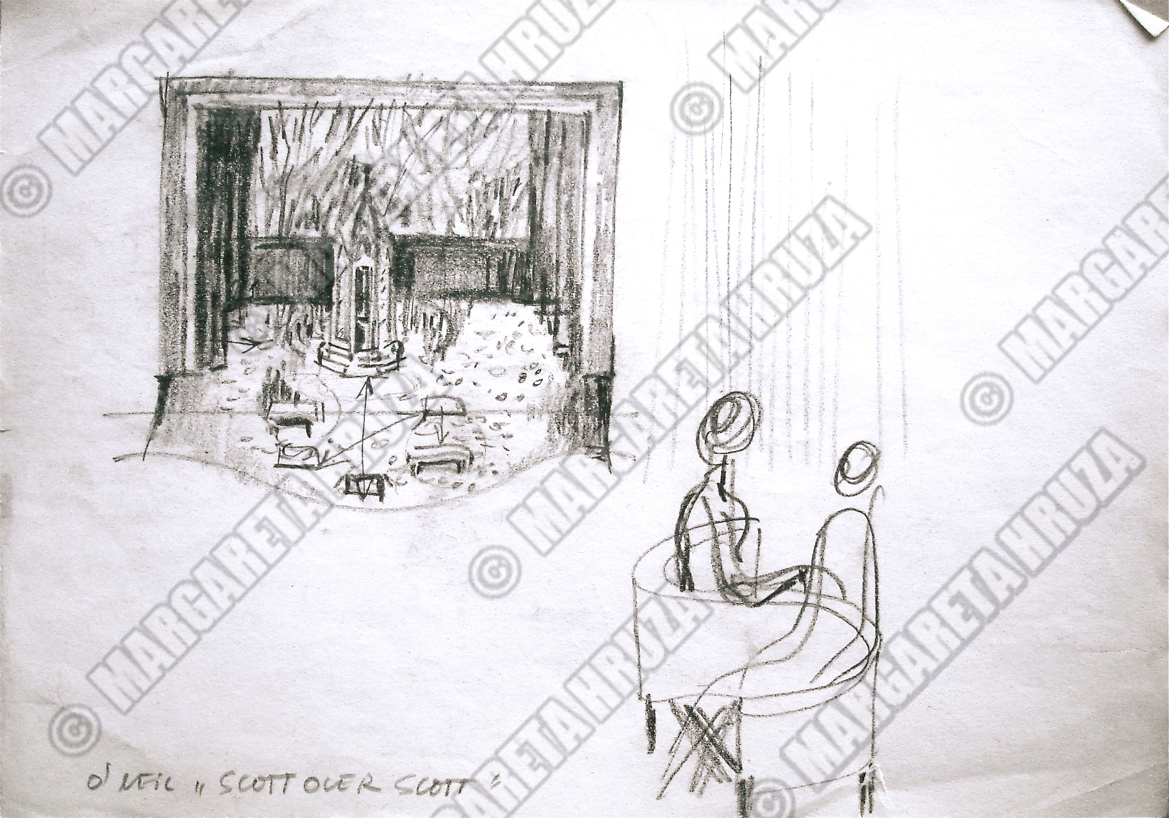 Tegning av scenografen Lubos Hruza til sceneløsning av oppsetning av Slott over slott(1974) av Eugene O´Neill. Produksjonen ble satt opp på Nationaltheatrets Hovedscene. og hadde premiere 25. september, 1974.