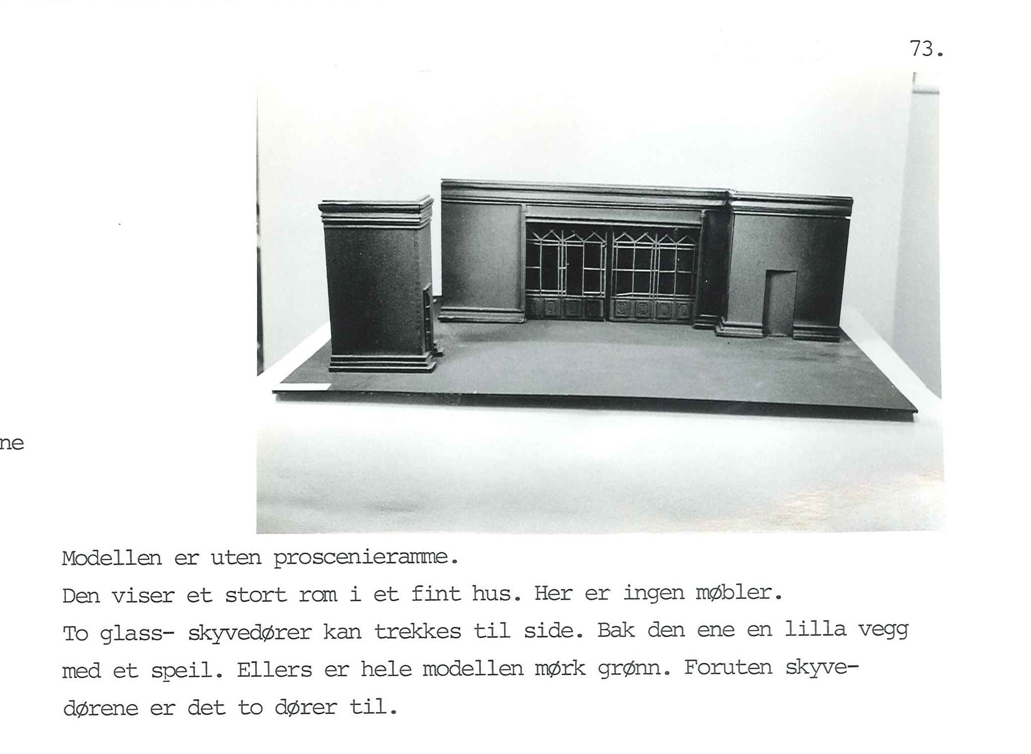 Beskrivelsen på bildet : Modellen er uten porscenieramme. Den viser et stort rom i et fint hus. Her er ingen møbler. To glass- skyvedører kan trekkes til side. Bak den ene en lilla vegg med et speil. Ellers er hele modellen mørk grønn. Foruten skyvedørene er det to dører til.