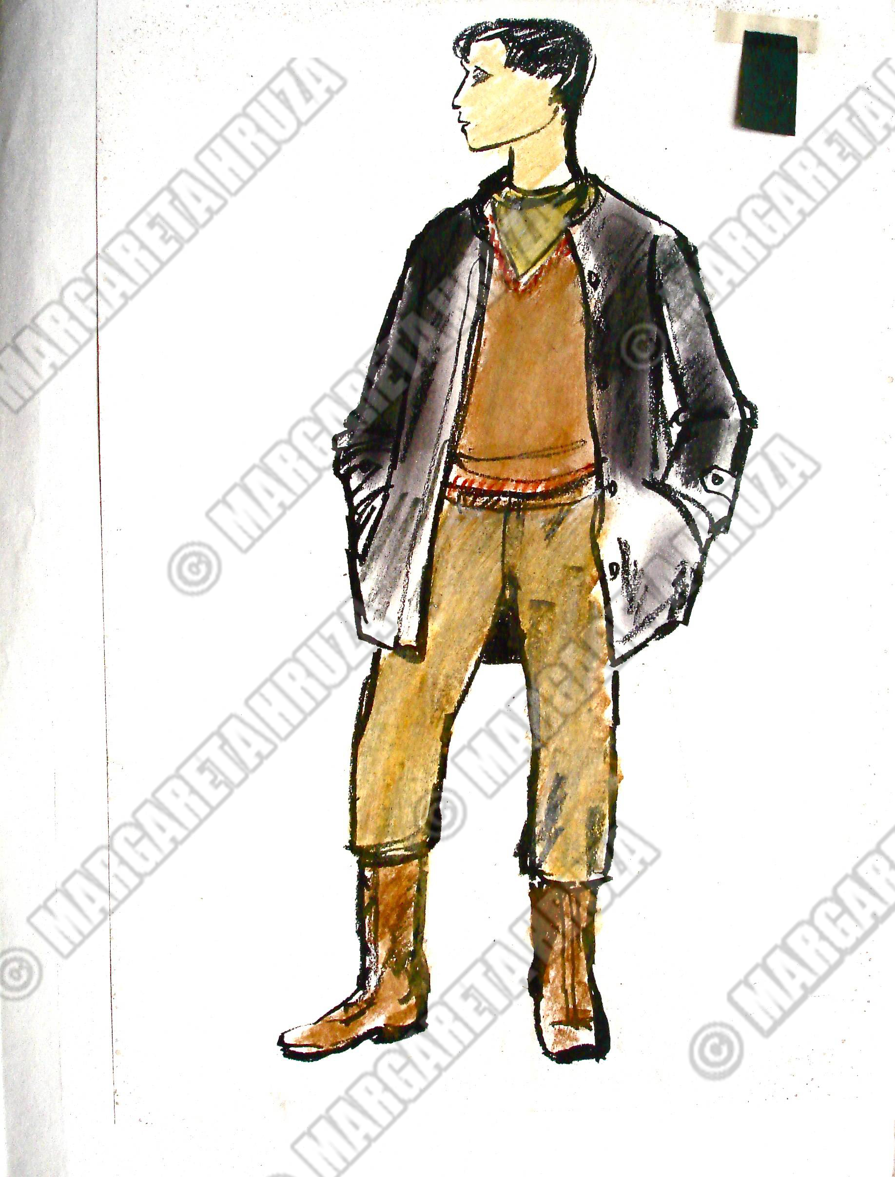 Kostymetegning av Lubos Hruza til skuespilleren Jan Ø. Wiig i rollen som Willy Carson i produksjonen Havet(1975). Produksjonen ble satt opp på Nationaltheatrets Hovedscene og hadde premiere 1. februar 1975.