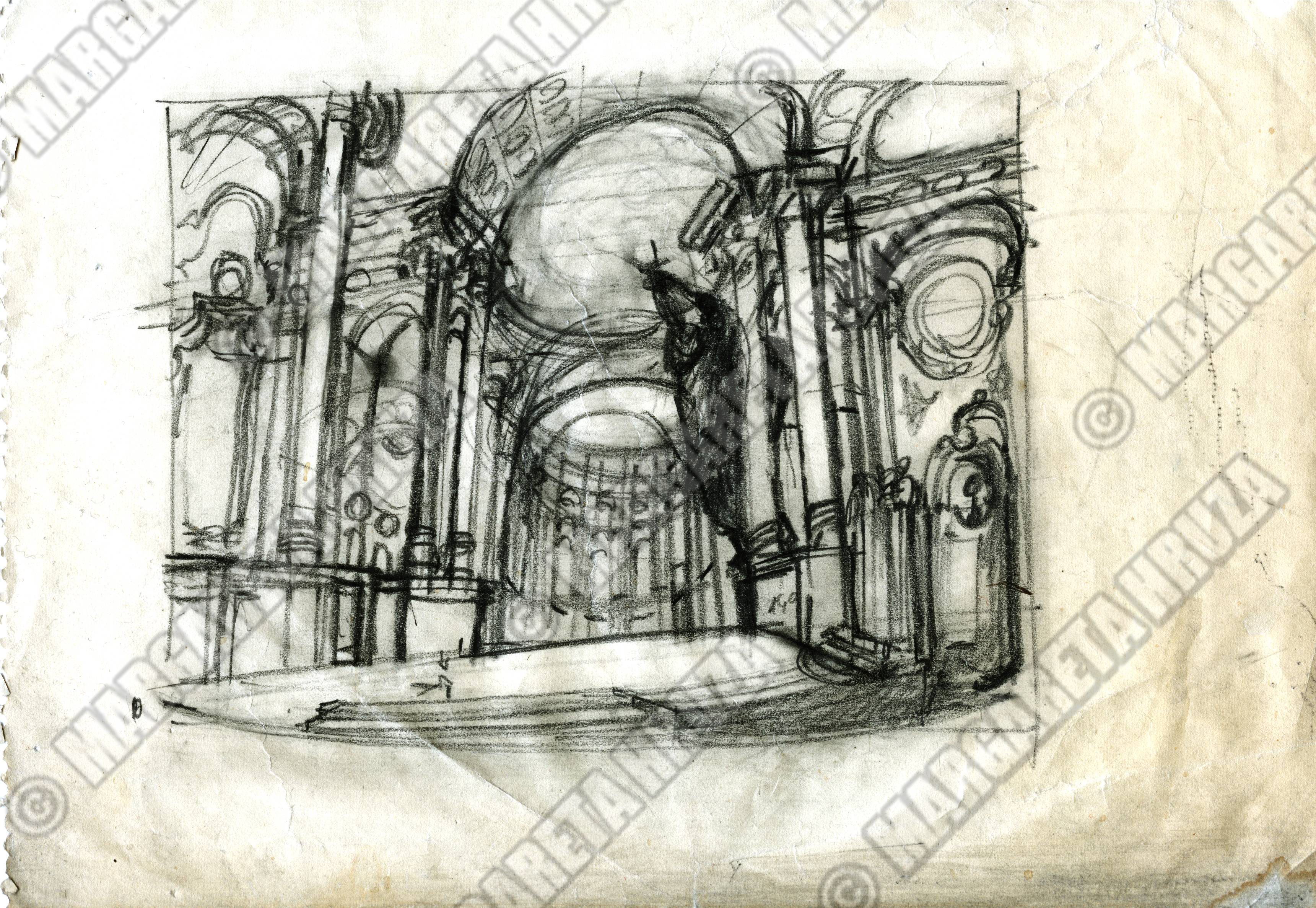 Tegning av Lubos Hruza av sceneløsningen til produksjonen Tosca, Den Norske Opera & Ballett (1976). Tegningen viser løsningen for første akt.