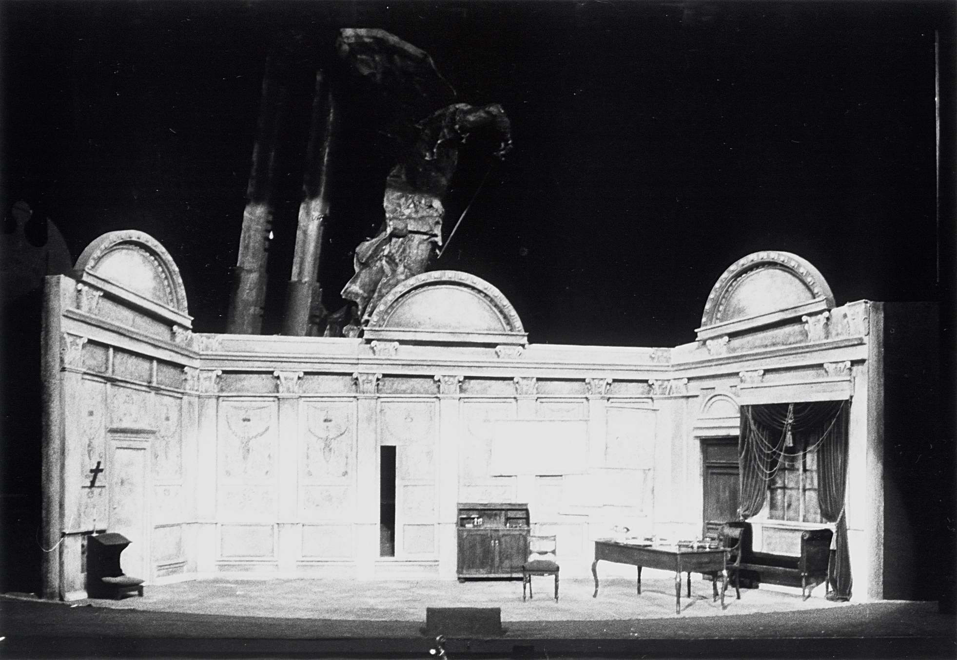Fotografi av scenografien til Lubos Hruza av andre akt i operaproduksjonen Tosca, Den Norske Opera & Ballett (1976). Andre akt tar sted i Scarpias leilighet i Palazzo Farnese i Roma.