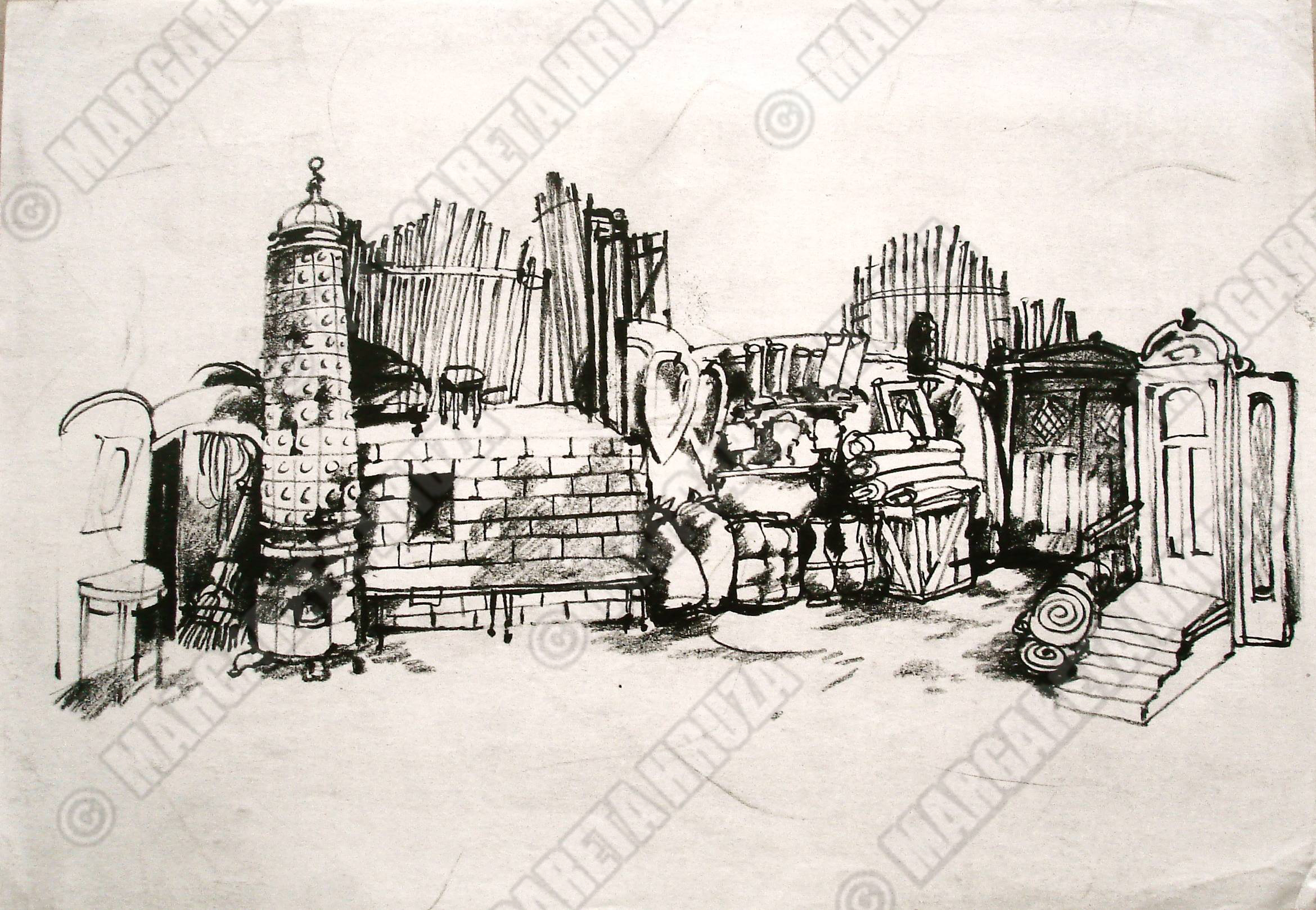 Tegning av Lubos Hruza av sceneløsningen til Revisoren (1977) av Nikolaj Gogol. Premiere var på Riksteatret 20. september, 1977.