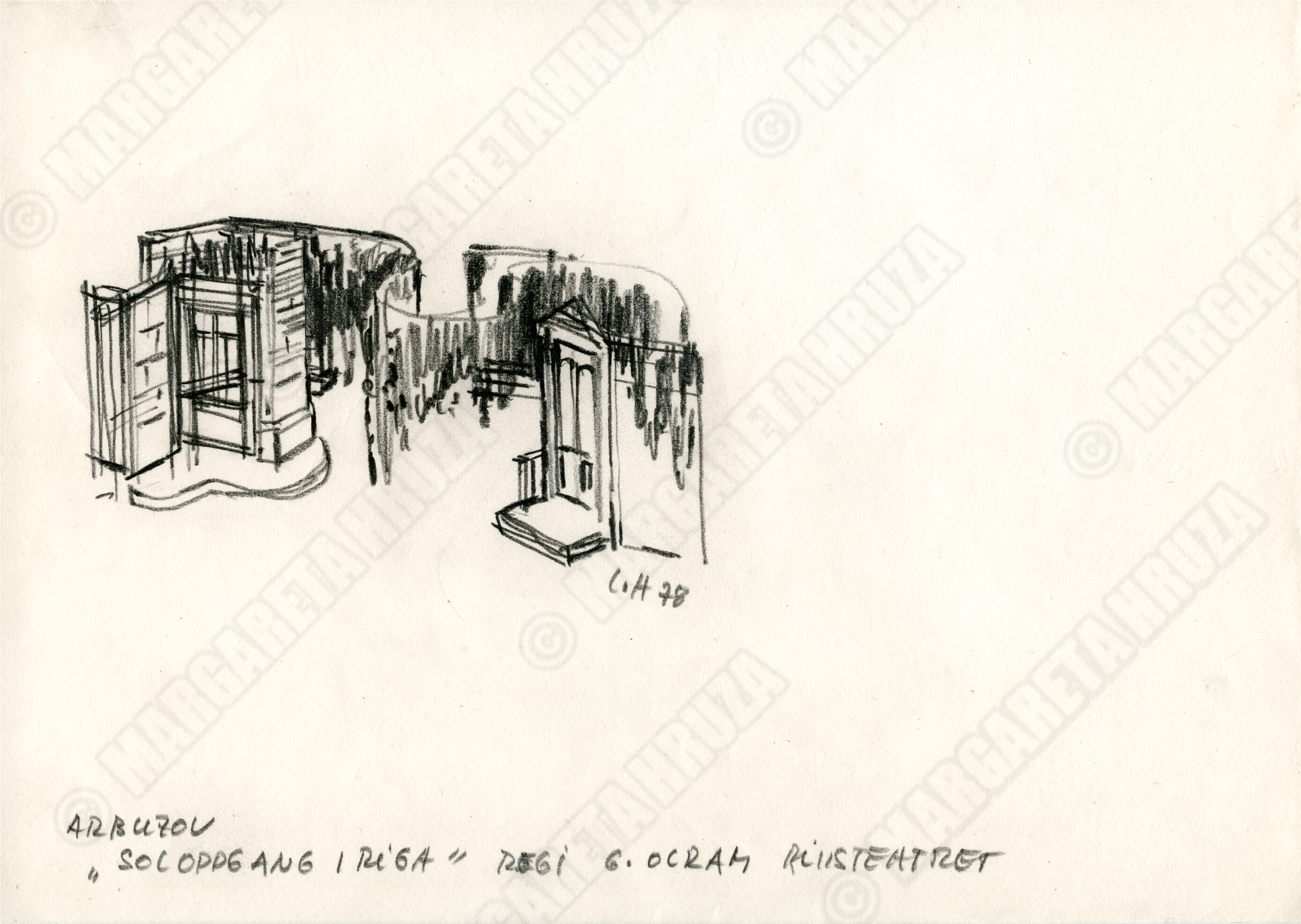 Tegning av sceneløsningen av Lubos Hruza til Det hendte i Riga, 1979, Riksteatret