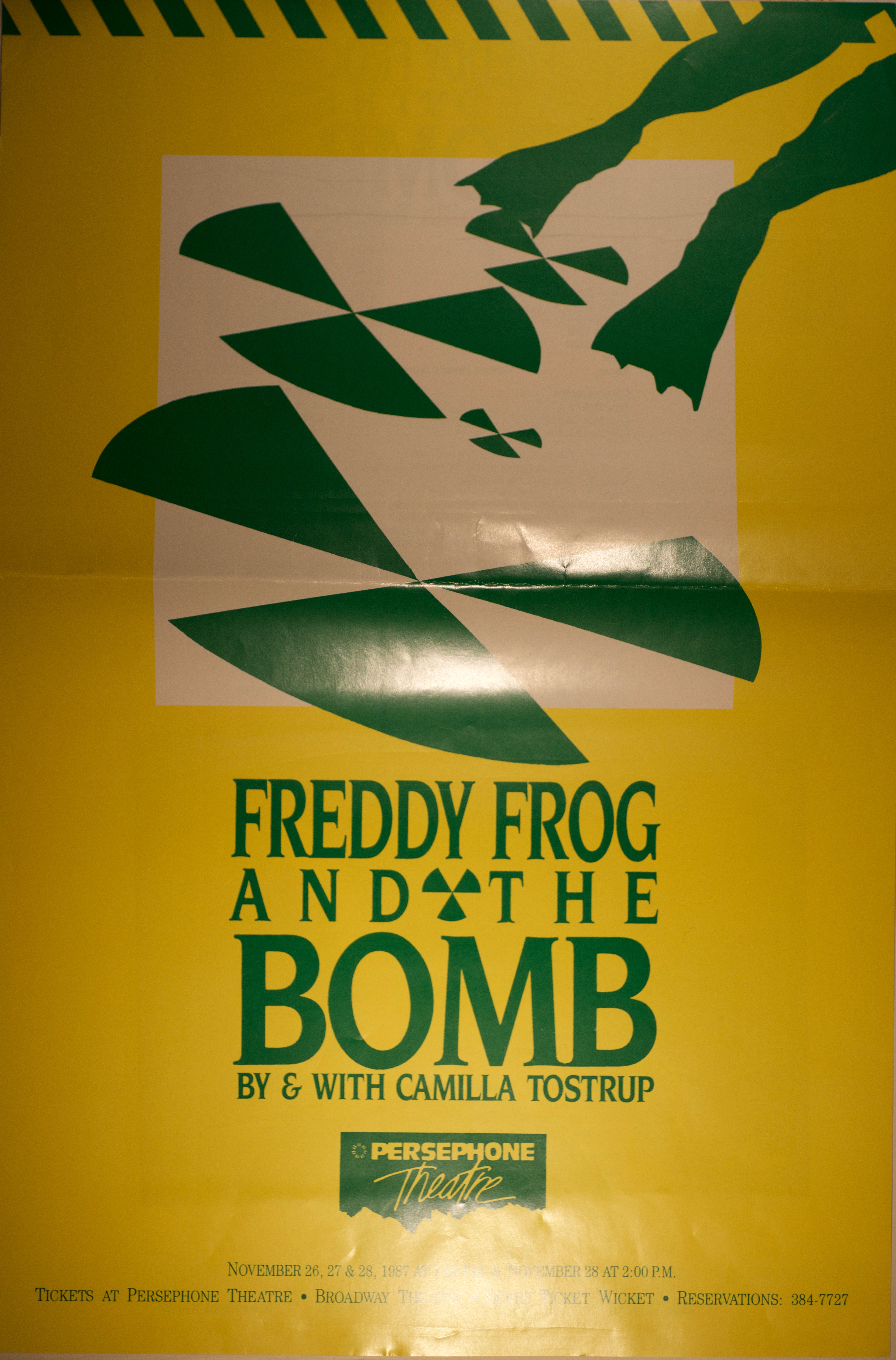 Plakat fra Musidra Teaters produksjon Frosken Benjamin og Bomba (1985). Plakaten er fra den engelske versjonen av produksjonen, med tittel Freddy Frog and the Bomb.