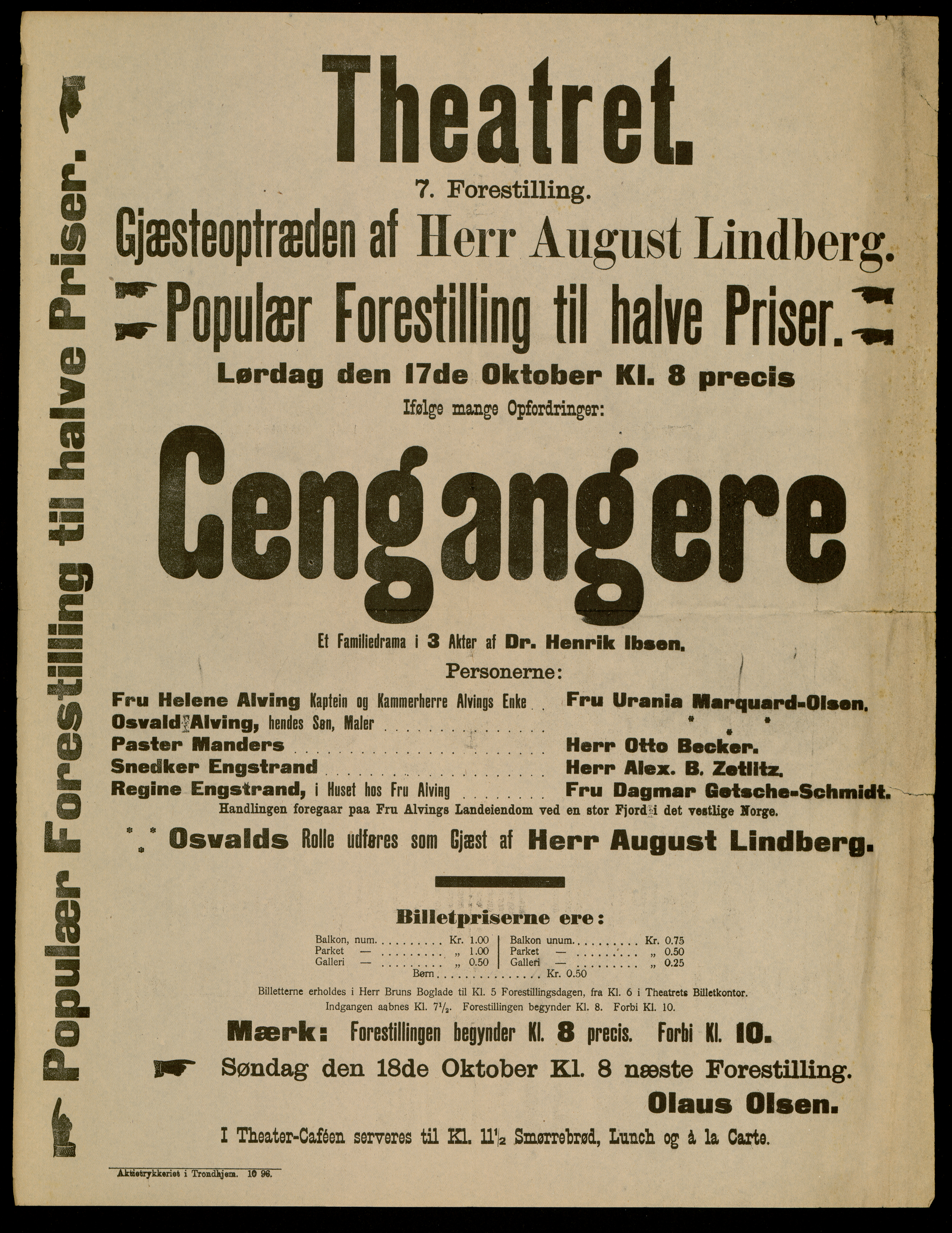 Plakat for Olaus Olsens Theaterselskabs produksjon Gengangere (1896). Denne plakaten er fra forestillingen på Trondhjems Nationale Scene 17. oktober 1896.