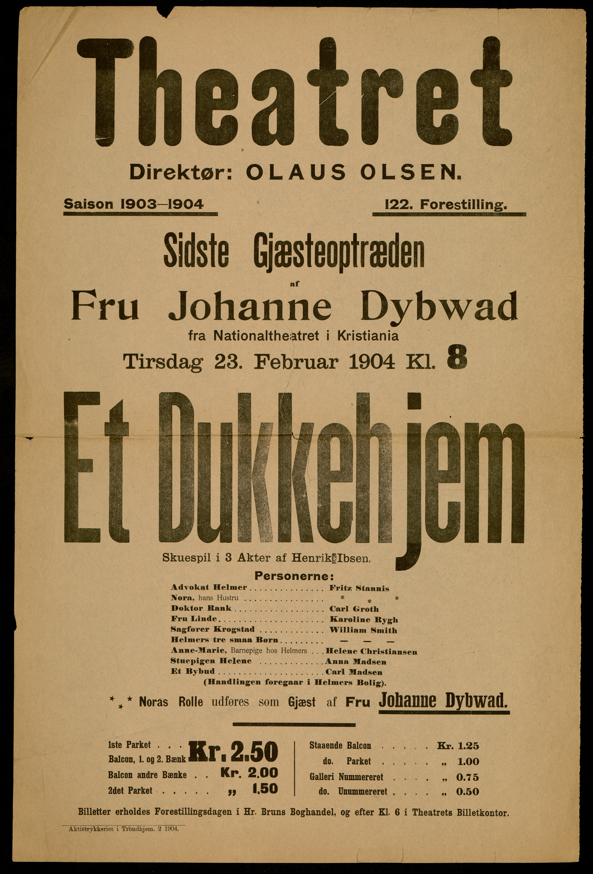 Plakat for Olaus Olsens Theaterselskabs produksjon Et Dukkehjem (1904). Denne plakaten er fra forestillingen på Trondhjems Nationale Scene 23. februar 1904.