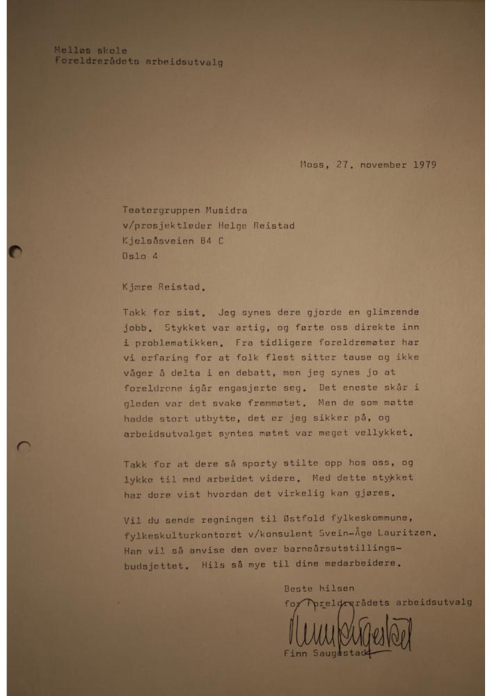 Brev til Musidra Teater fra Foreldrerådets arbeidsutvalg ved Melløs skole angående produksjonen Hjemmebarn og Fremmedbarn(1979).