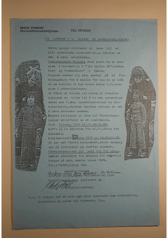 Kursinvitasjon til lærere i Bærum kommune. Knyttet til pedagogisk opplegg for Musidra Teaters produksjon Sella-re-atag (1980).