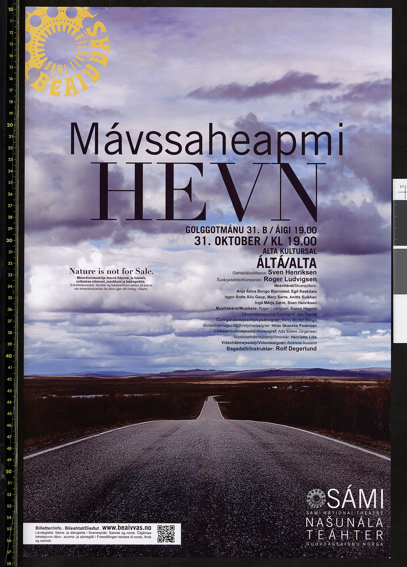 Plakat for Beaivváš Sámi Našunálateárhtes produksjon Mávssaheapmi / Hevn (2016). Plakaten er fra forestillingen i Alta kultursal 31. oktober 2016.