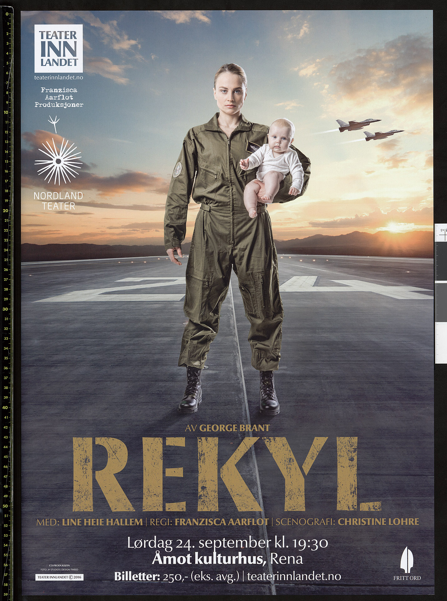 Plakat for Teater Innlandet, Franzisca Aarflot Produksjoner og Nordland Teaters produksjon Rekyl (2016). Plakaten er fra forestilling 24. september 2016 på Åmot kulturhus.