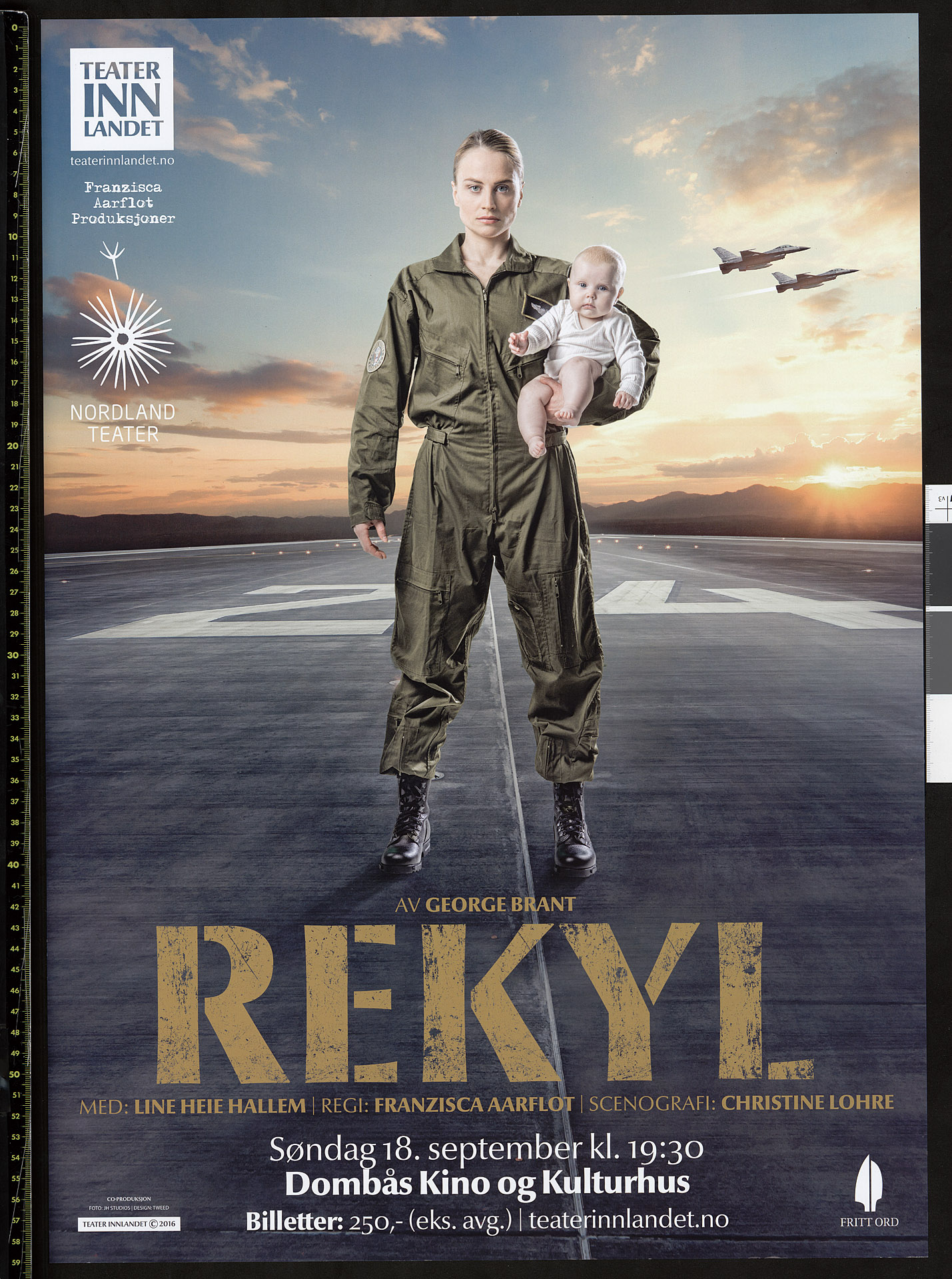Plakat for Teater Innlandet, Franzisca Aarflot Produksjoner og Nordland Teaters produksjon Rekyl (2016). Plakaten er fra forestilling 18. september 2016 på Dombås Kino og Kulturhus.