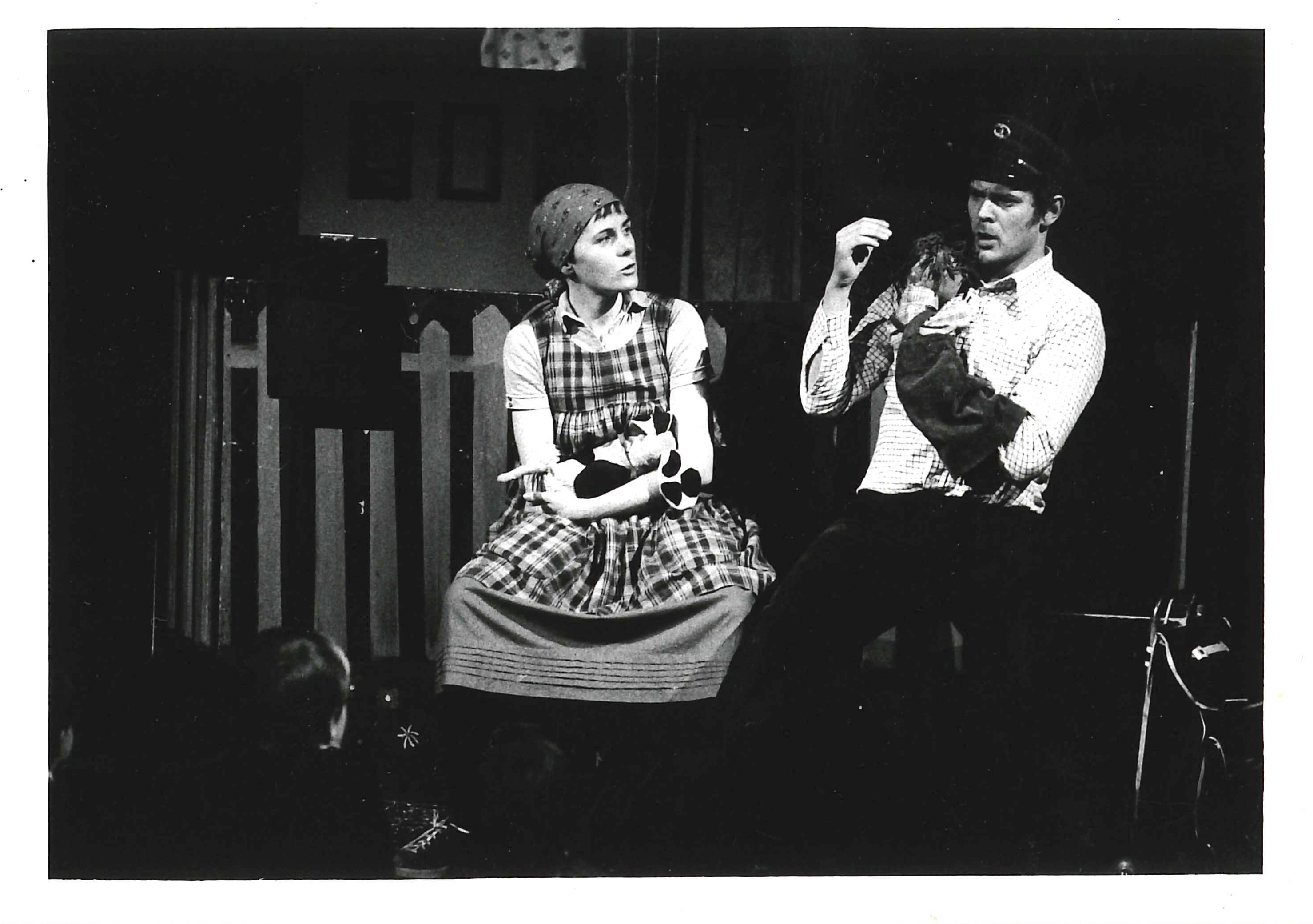 Fotografi fra Musidra Teaters produksjon Fru Petrine Sørensen(1977). Nyinstudering av Musidra Teater med Camilla Tostrup Worsley og Per Skjølsvik. (Scenario m.m.: Helge Reistad, Kristin Holteng og Per Skjølsvik, musikkdramatisk utgave). Regi: Helge Reistad.