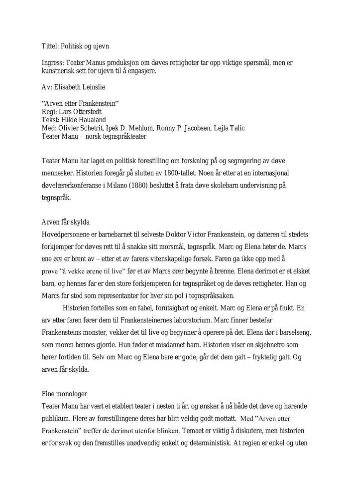 Politisk og ujevn. Anmeldelse av Teater Manus produksjon Arven etter Frankenstein (2007). Anmeldelsen ble publisert i Dagsavisen 15. april 2007.