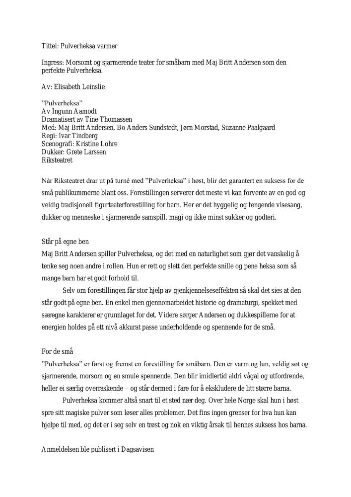 Pulverheksa varmer. Anmeldelse av Riksteatrets produksjon Pulverheksa (2007). Anmeldelsen ble publisert i Dagsavisen 3. september 2007.