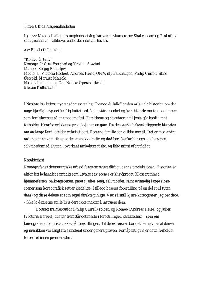 Uff da Nasjonalballetten. Anmeldelse av Den Norske Opera & Balletts produksjon Romeo & Julie (2007). Anmeldelsen ble publisert i Dagsavisen i 2007, dato ukjent.