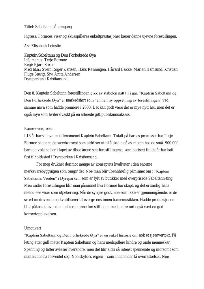 Sabeltann på tomgang. Anmeldelse av Kristiansand Dyreparks produksjon Kaptein Sabeltann og Den Forheksede Øya (2007). Anmeldelsen ble publisert i Dagsavisen i 2007, dato ukjent.