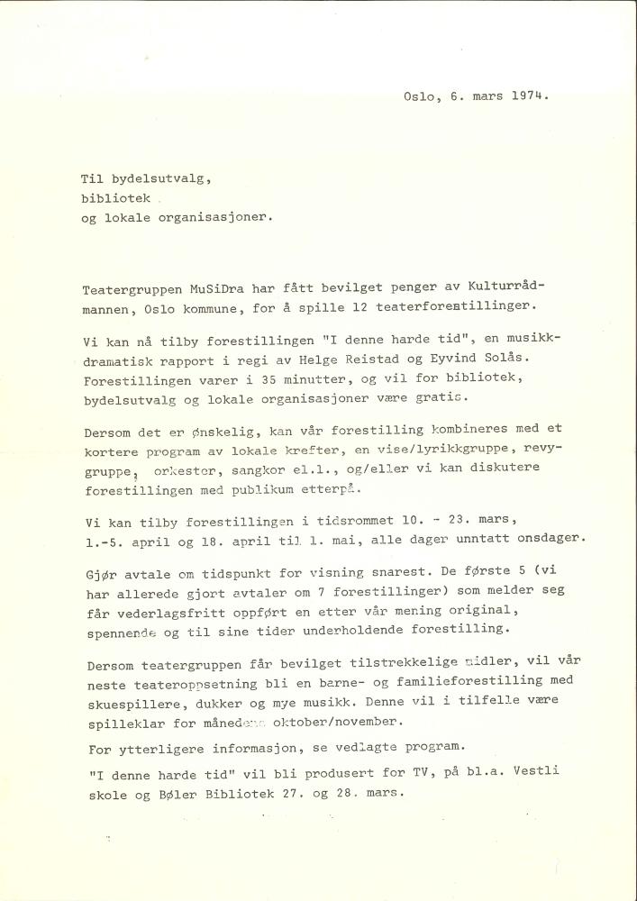 Brev fra Musidra Teatergruppe til bydelsutvalg, bibliotek og lokale organisasjoner. Oslo, 6. mars 1974