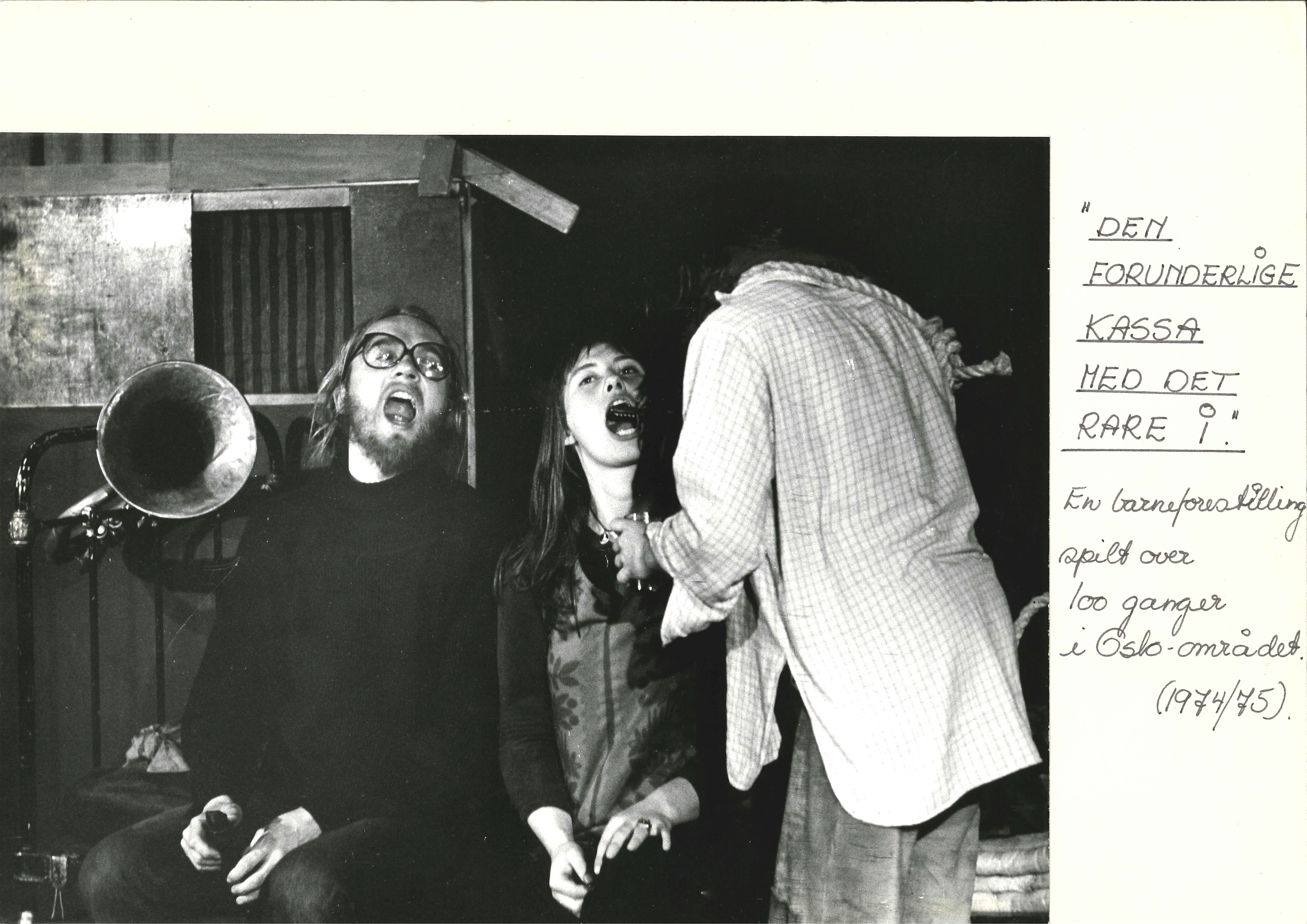 Fotografi fra Hønseføtter & Gulerøtter og Musidra Teaters produksjon Den allvitende kassa (1974)