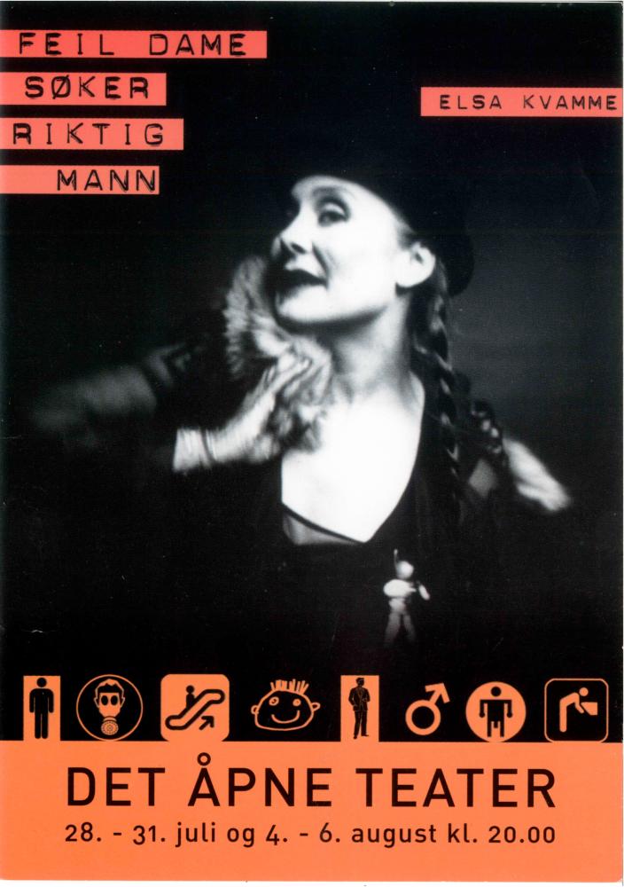 Flygeblad fra Elsa Kvammes produksjon Feil dame søker riktig mann (1999).