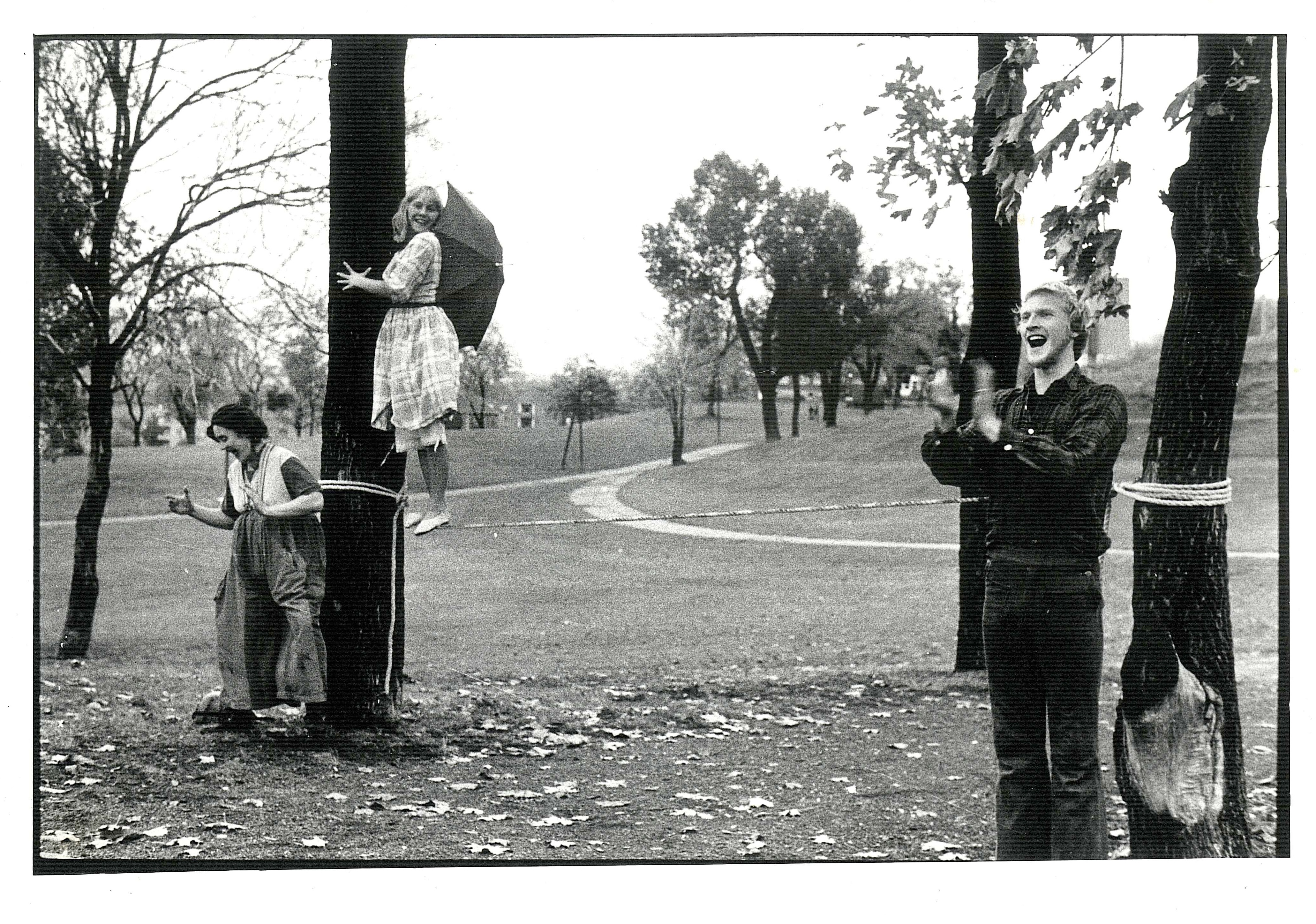 Fotografi fra Saltkompagniets produksjon Klovner må leve (1978). Bildet er fra trening i Tøyenparken i 1977.