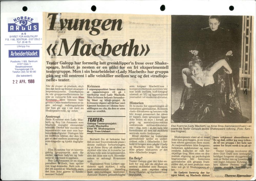 Tvungen "Macbeth". Anmeldelse av Galopp Teaterprosjekters produksjon Lady Macbeth (1988). Anmeldelsen ble publisert i Arbeiderbladet 22. april 1988.