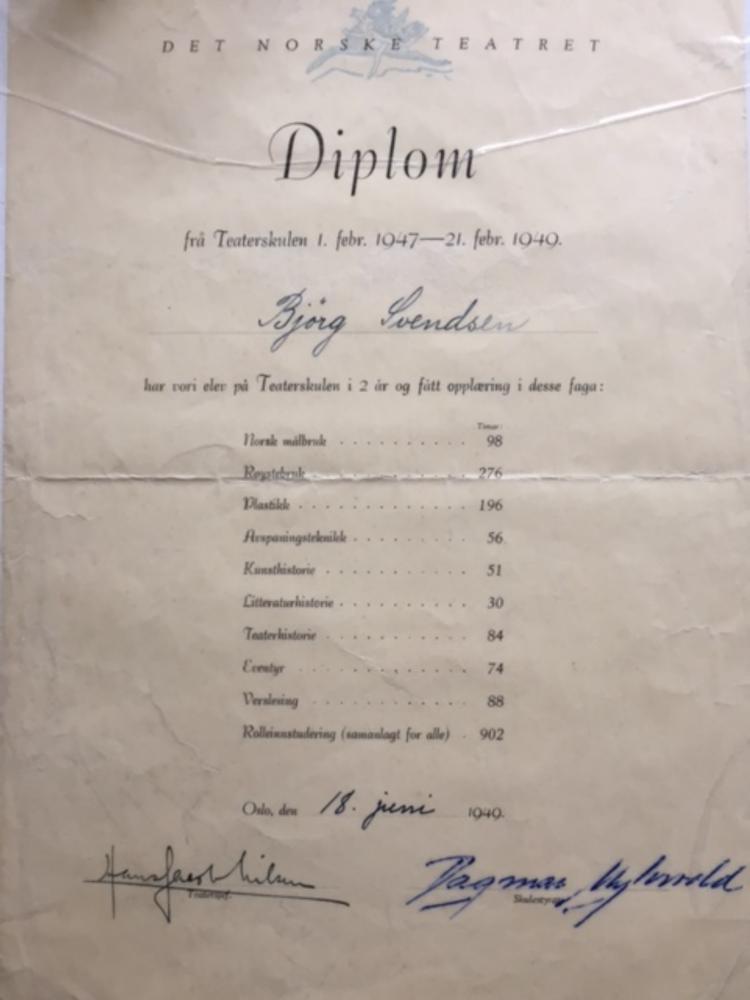 Diplom for skuespiller Bjørg Svendsen, Det Norske Teatrets Teaterskule.