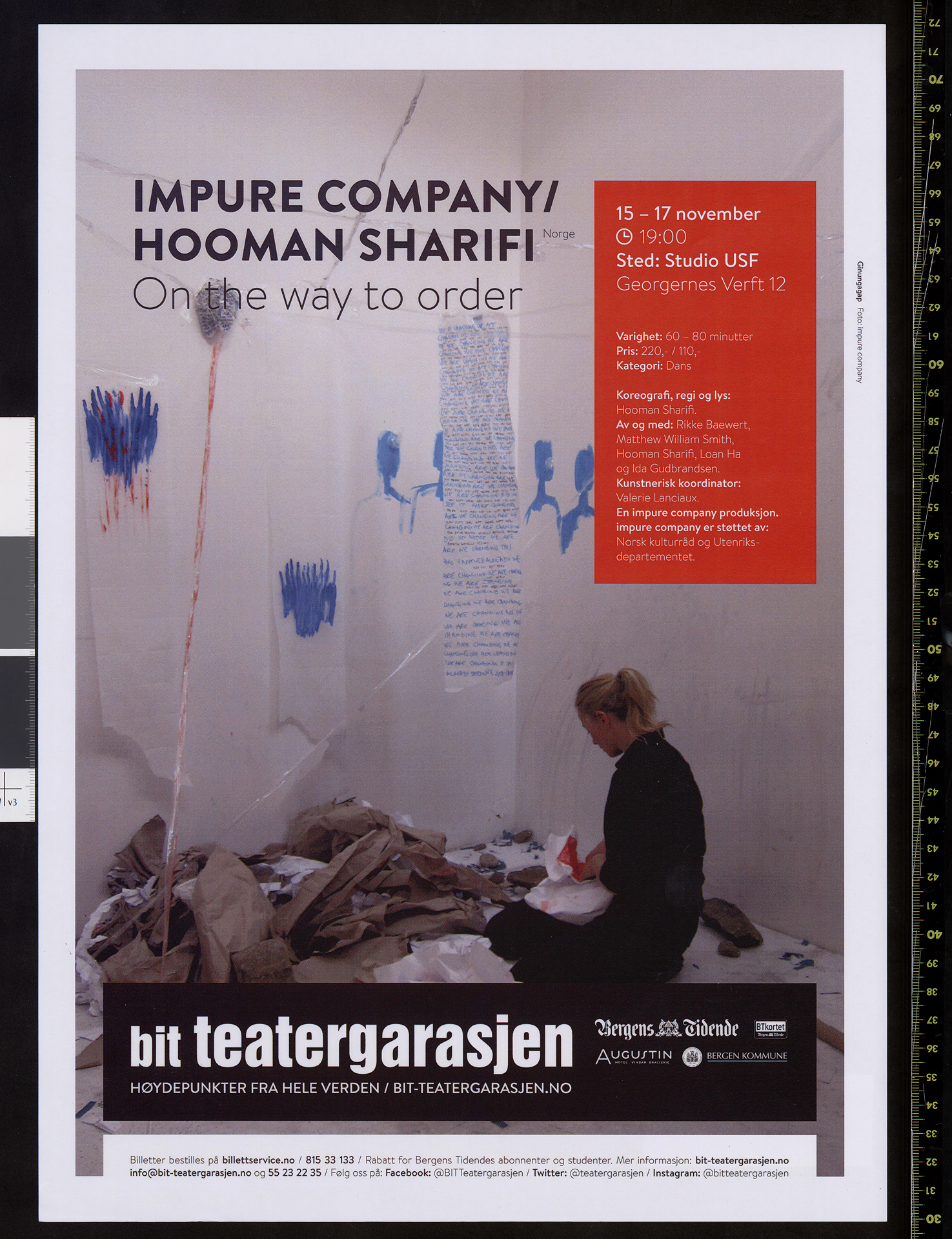 Plakat for Impure Companys produksjon On the way to order (2013). Plakaten er fra spillingen på BIT Teatergarasjen i Bergen i november 2013.