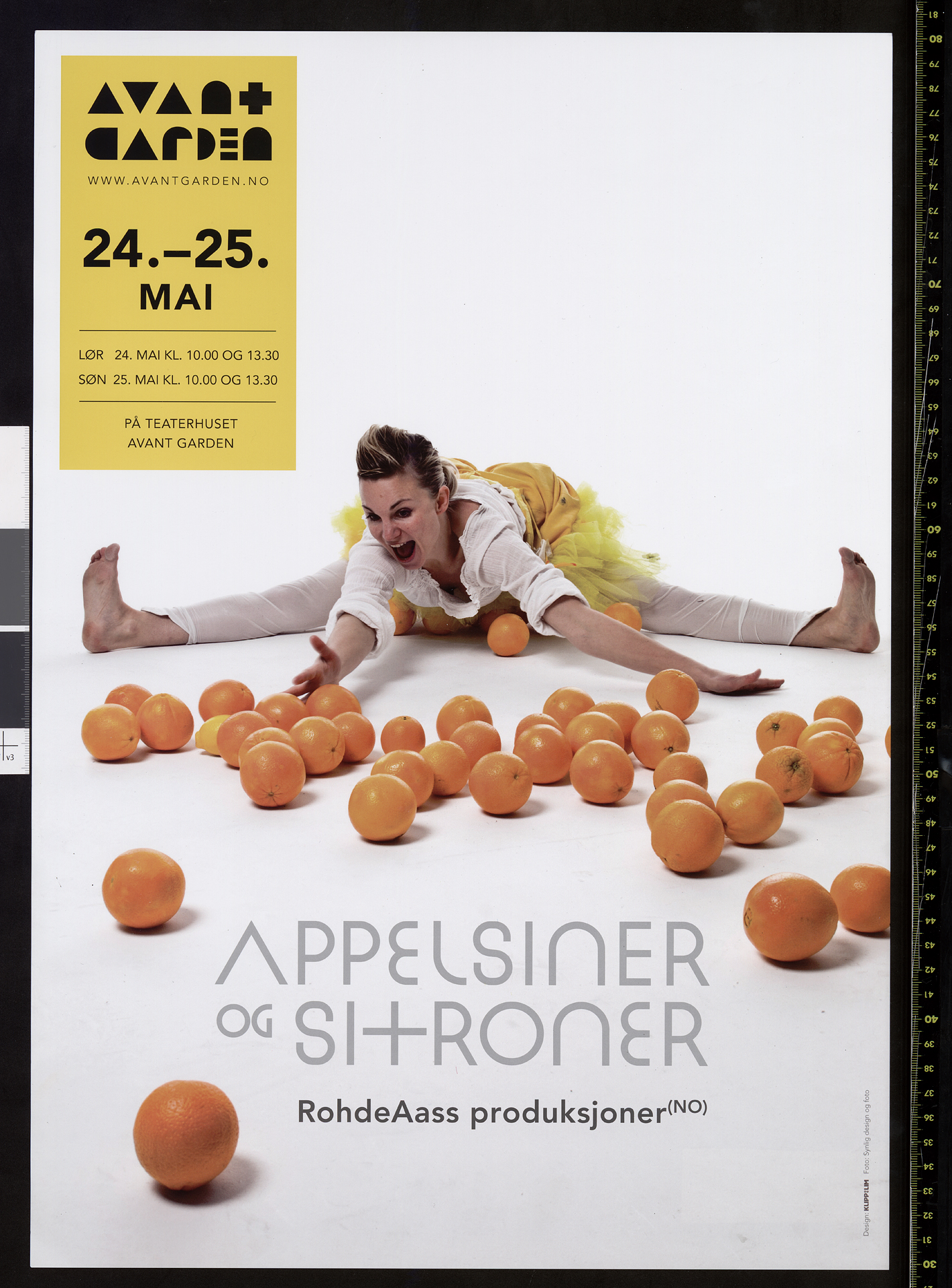 Plakat for RohdeAass PRoduksjoners produksjon Appelsiner og Sitroner (2011). Plakaten er fra forestillingene på Teaterhuset Avant Garden i mai 2014.