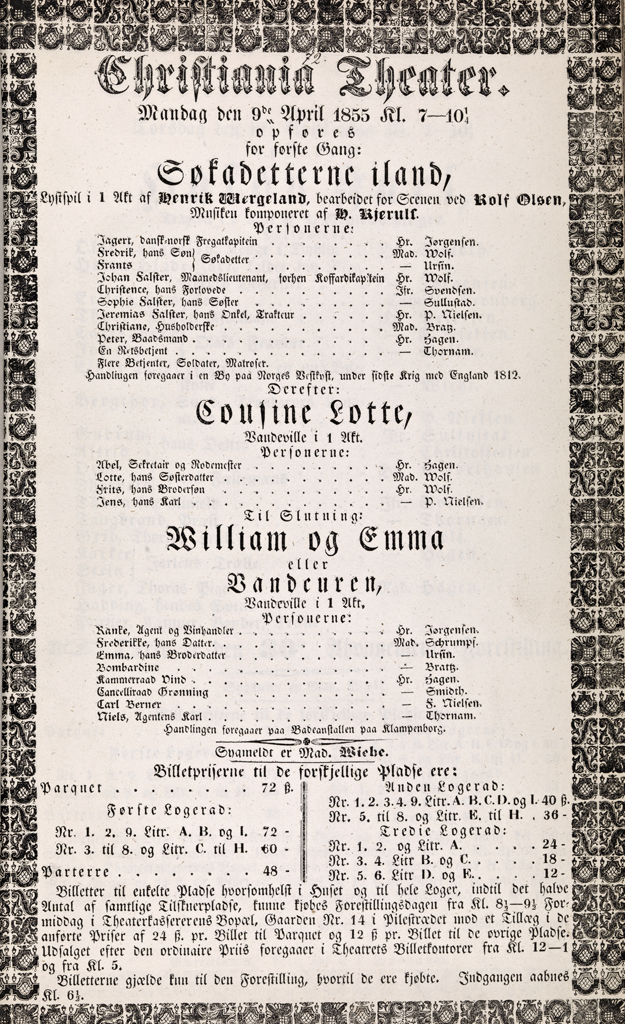 Plakat fra Christiania Theaters produksjoner Søkadetterne iland, Cousine Lotte og William og Emma (1855)