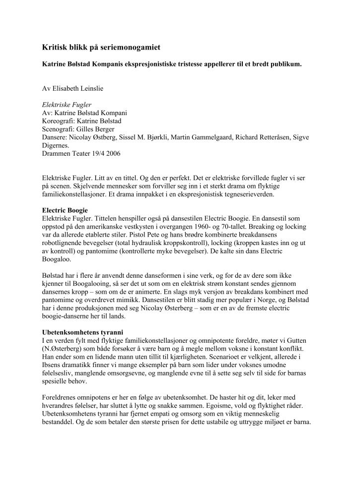 Kritisk blikk på seriemonogamiet. Anmeldelse av Katrine Bølstad Kompanis produksjon Elektriske Fugler (2006). Anmeldelsen ble publisert i Norsk Shakespeare- og Teatertidsskriftnr 2/2006.