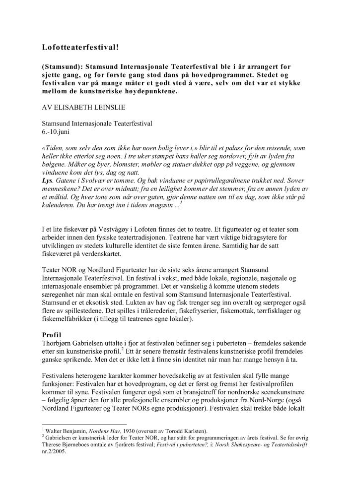 Lofotteaterfestival!. Anmeldelse av Stamsund Internasjonale Teaterfestival (2006). Anmeldelsen ble publisert i Norsk Shakespeare- og Teatertidsskrift nr. 3-4 2006.