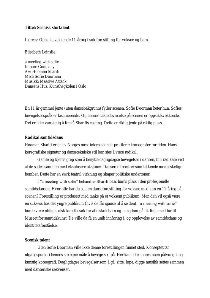 Scenisk stortalent. Anmeldelse av Impure Companys produksjon a meeting with sofie (2006). Anmeldelsen ble publisert i Dagsavisen 2006.