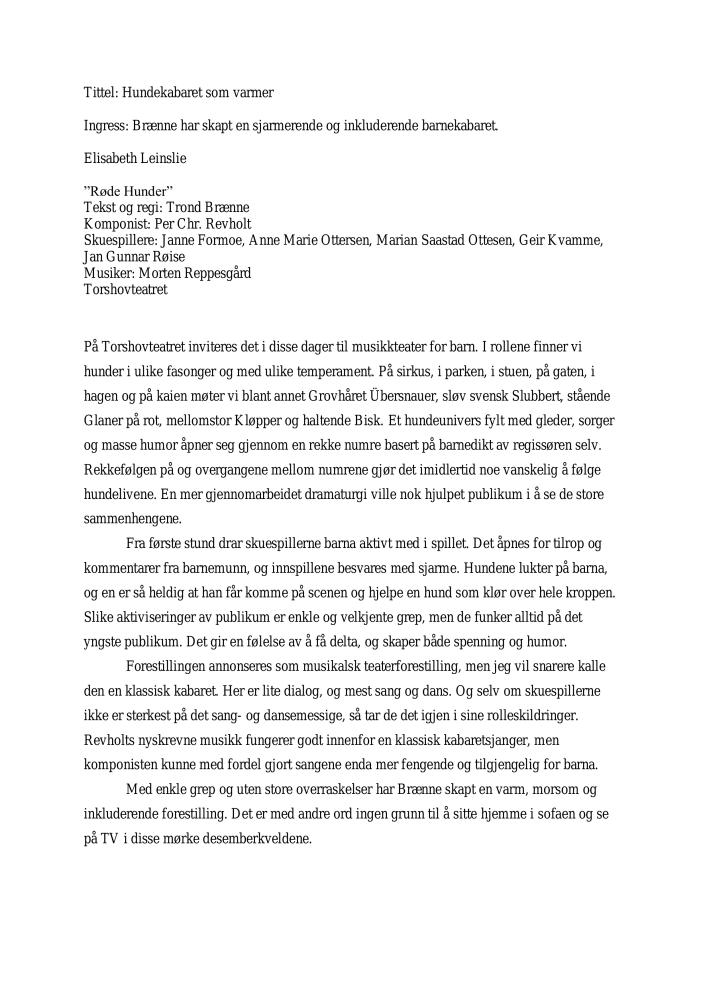 Hundekabaret som varmer. Anmeldelse av Nationaltheatrets produksjon Røde Hunder (2006). Anmeldelsen ble publisert i Dagsavisen 7. desember 2006.